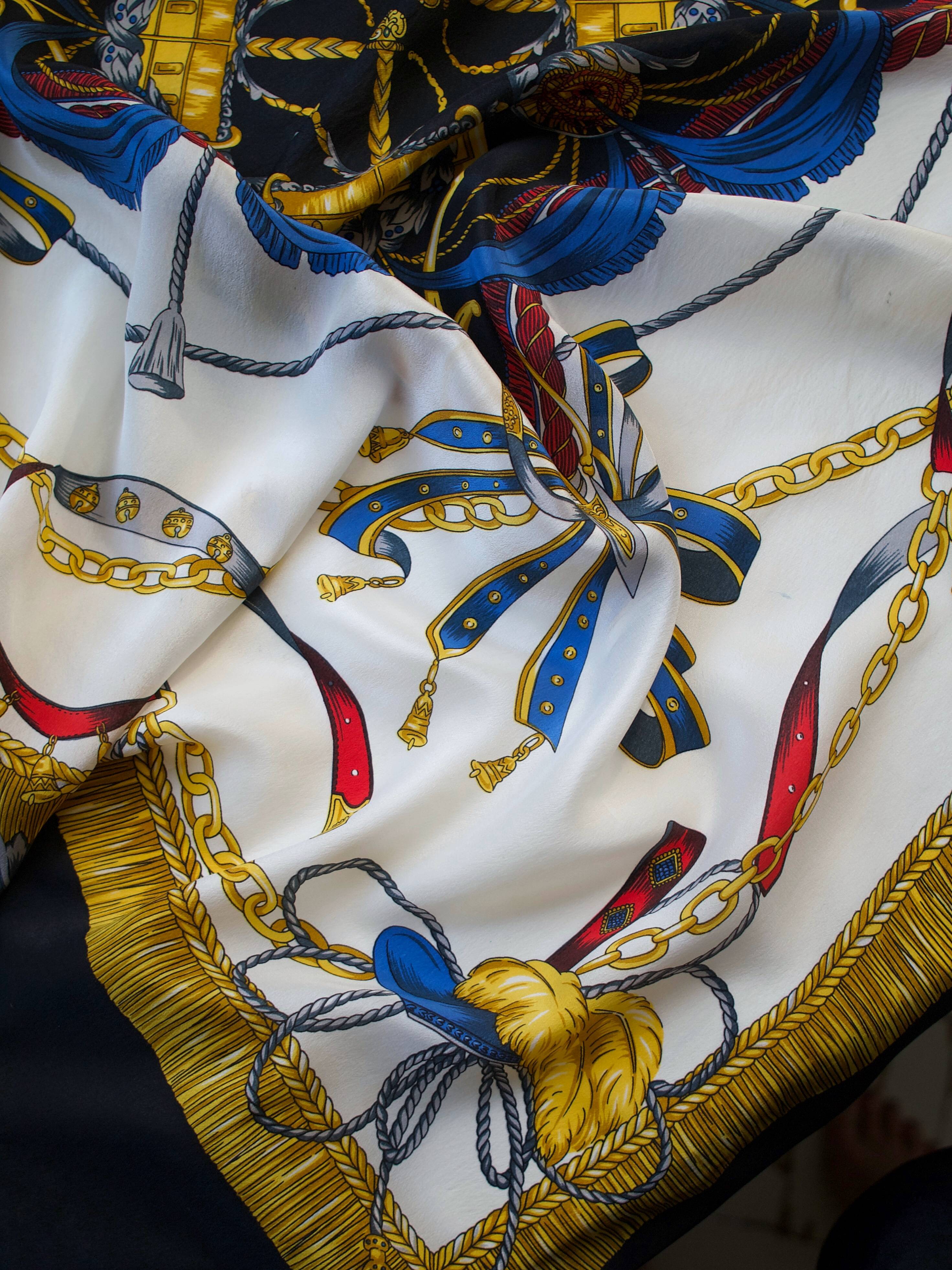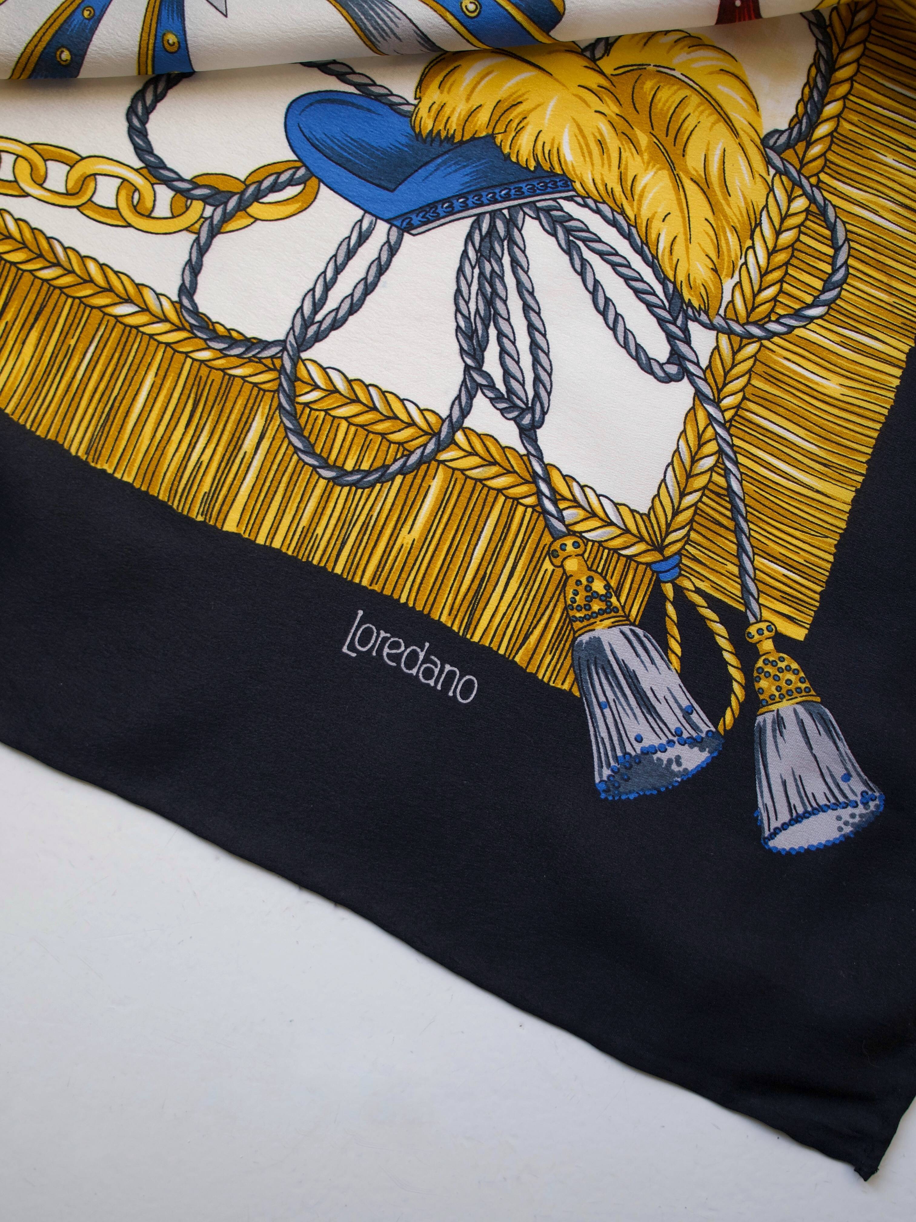Duża jedwabna chusta marki Loredano. Vintage z lat 80-ch. W niektórych miejscach przebarwienia, nie są widoczne w noszeniu. Wymiary: 89*87 cm