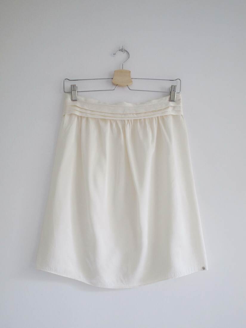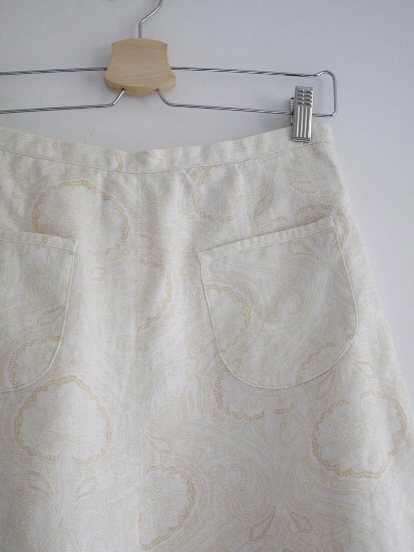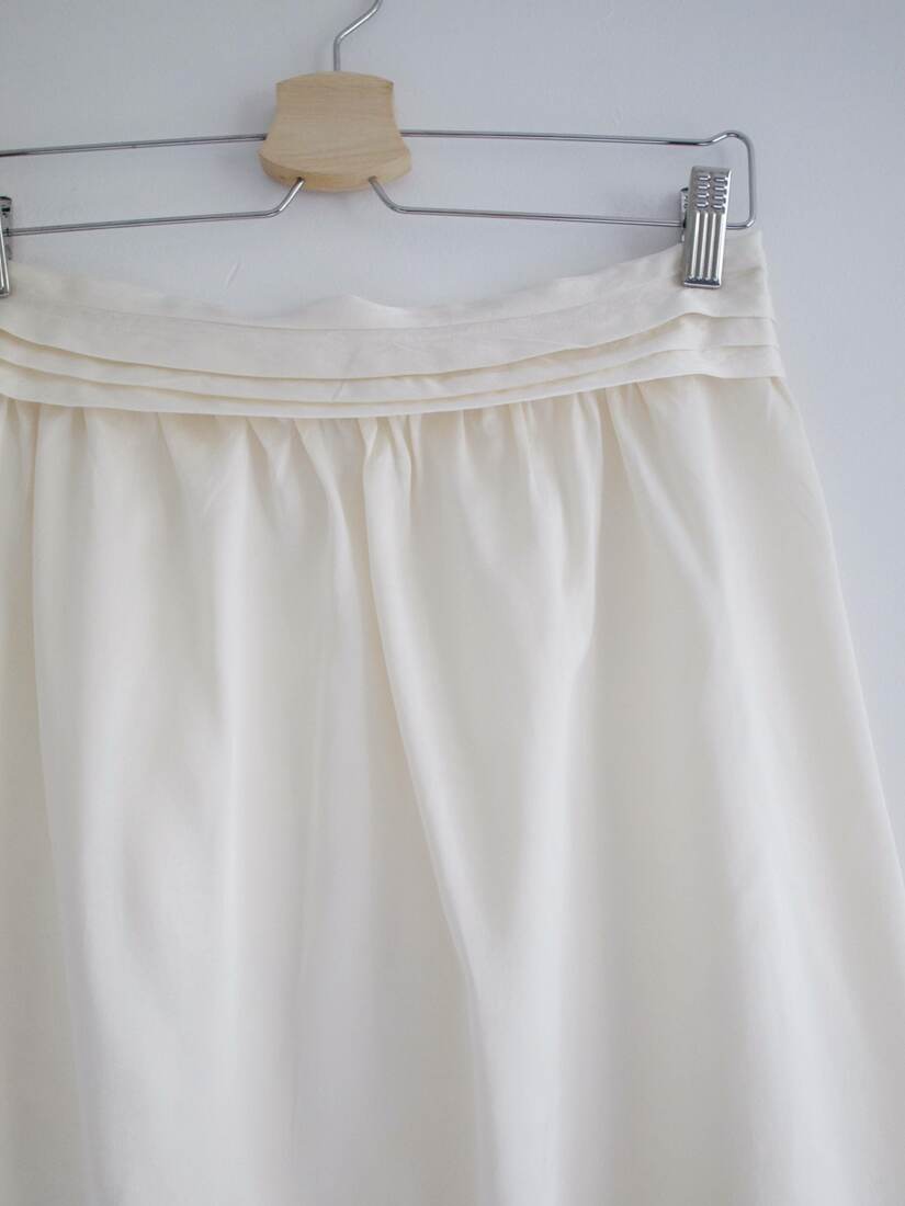 Jedwabna spódnica, szyta według czyjegoś projektu. Zapinana z tyłu na napy i haftki.