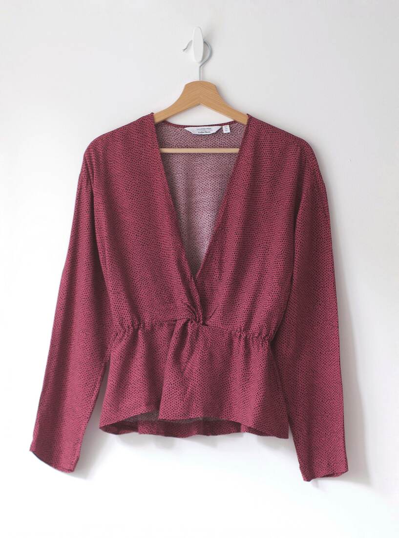 Rozmiar z metki 38, luźny Skład 93% jedwab, 7% spandex Stan bardzo dobry, delikatne wyświecenia na tkaninie