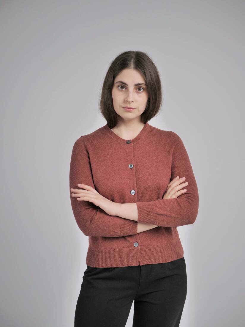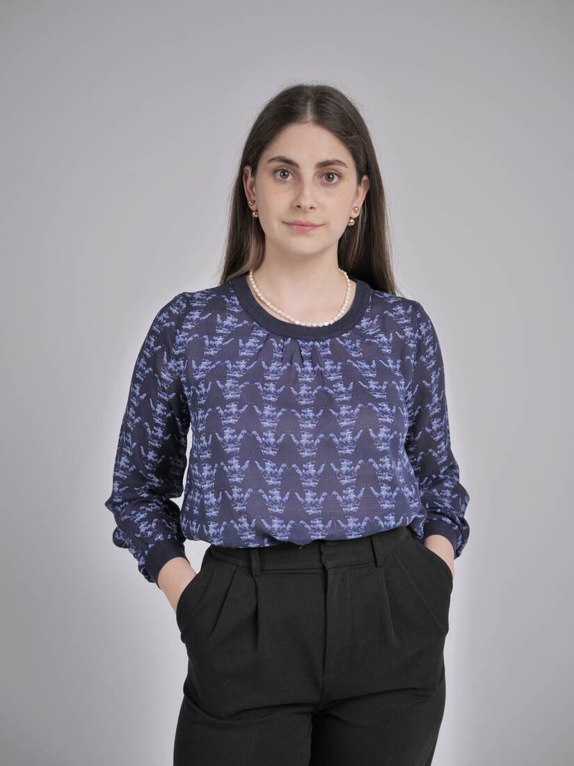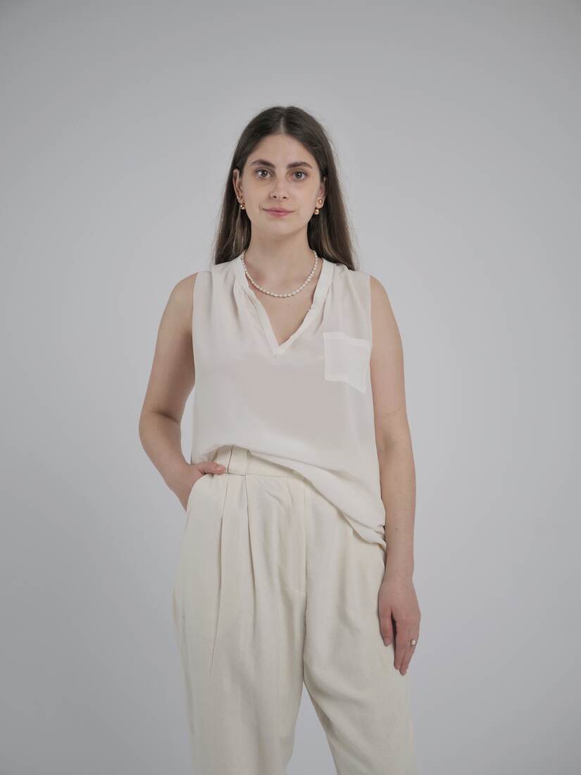 Modelka ma 165 cm wzrostu i nosi rozmiar XS-S.Szerokość w klatce 47 cm