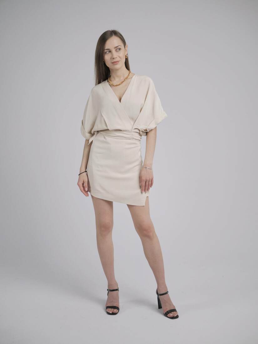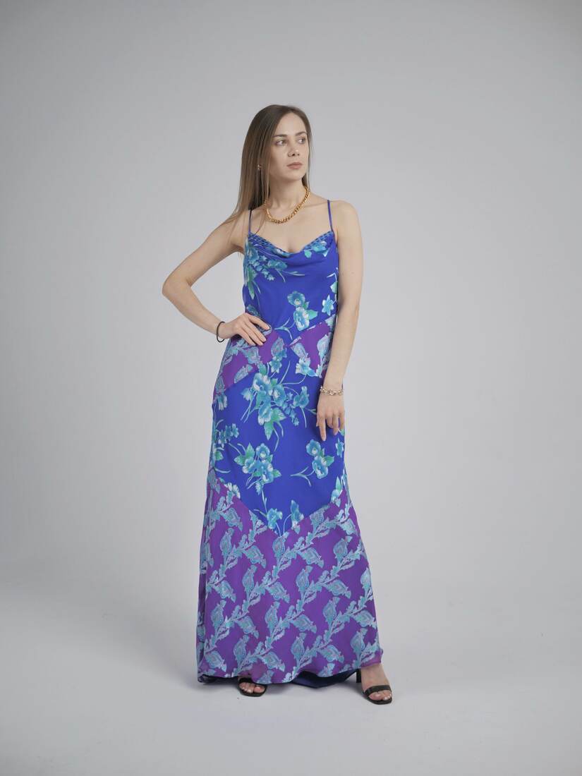 Modelka ma 165 cm wzrostu i nosi rozmiar XS-S, sukienka została spięta do zdjęć.