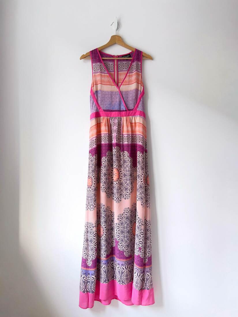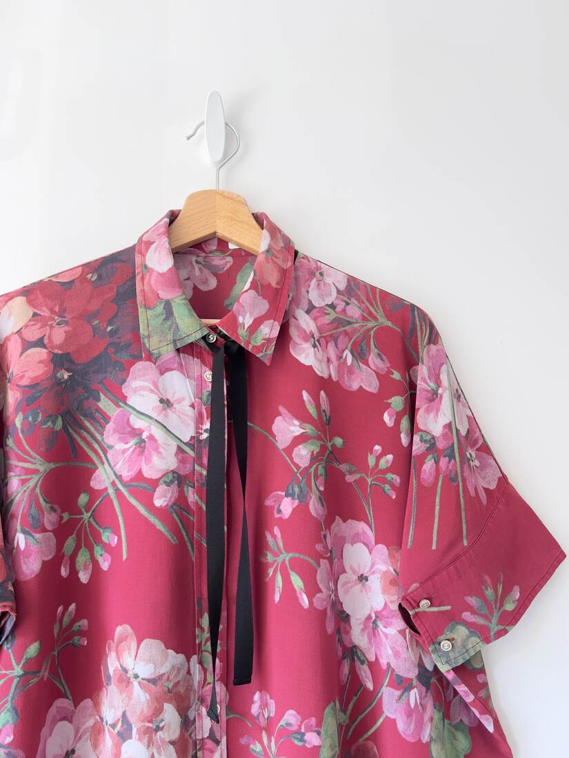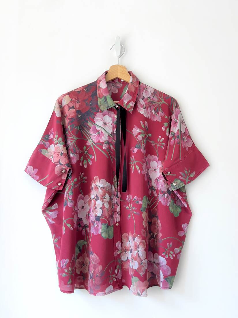 350,00 złBluzka domu mody Gucci, vintage model Blooms Silk Cape Blouse. Cena katalogowa to 1055 aud, czyli ponad 700$. Metki wewnętrzne są wycięte, jednak po całości bluzki są delikatnie wpisane we wzór logotypy marki. Zapinana na logowane guziki. Ze względu na fason polecam jako one size.