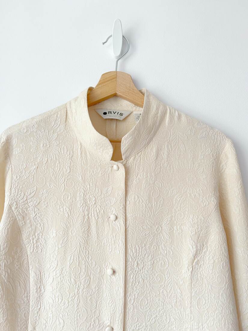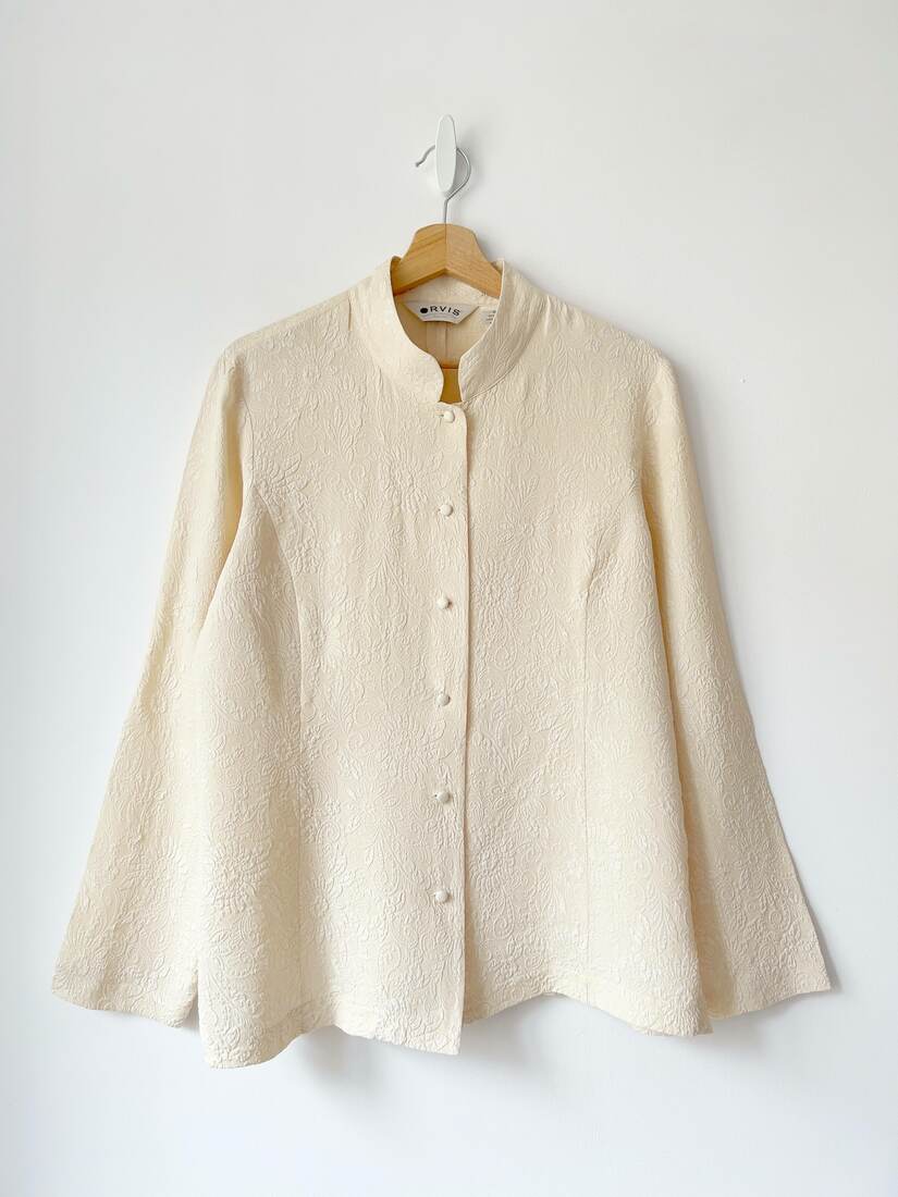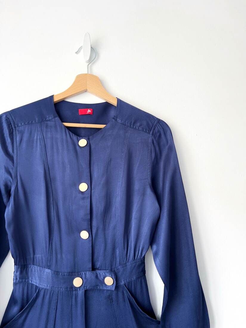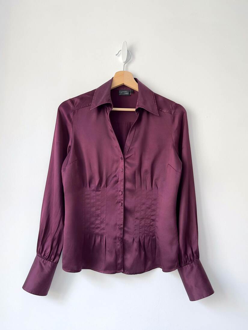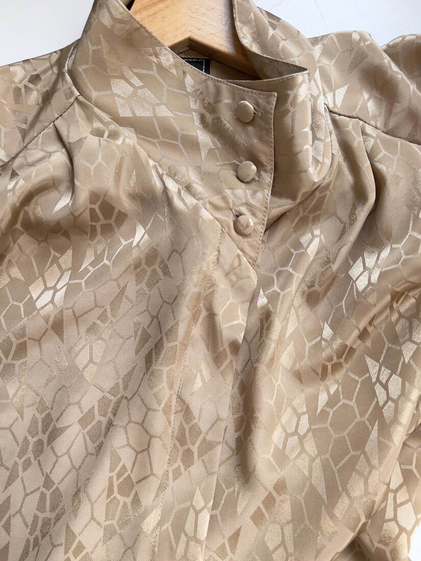 80,00 złJedwabna koszula vintage, zapinana na piękne guziki powlekane jedwabną tkaniną. Rozmiar z metki 8, polecam na XS-S. Pod pachami ma delikatne rozciągnięcia materiału, pokazane na zdjęciach w zbliżeniu. Nie są widoczne w noszeniu. Poza tym bez wad.