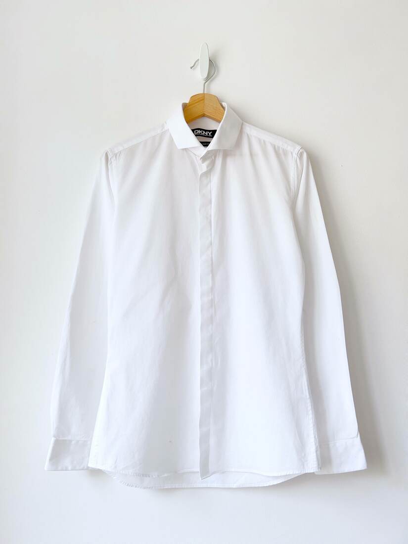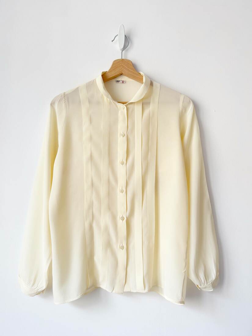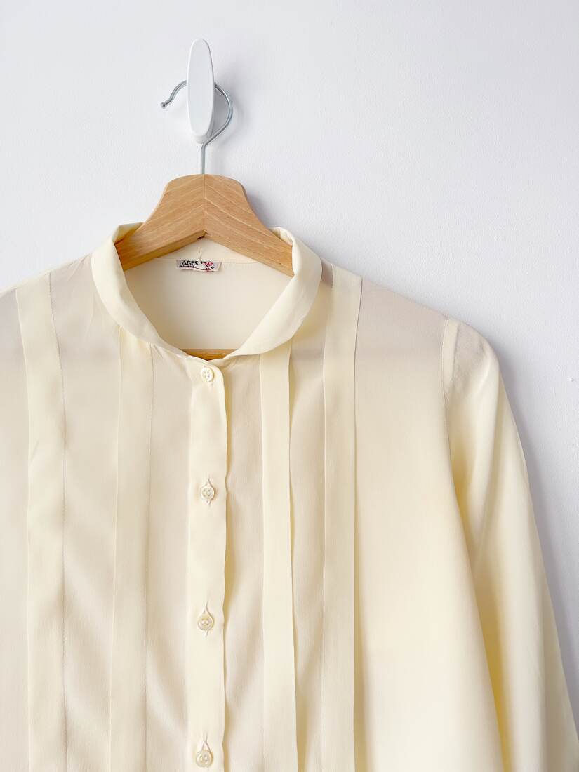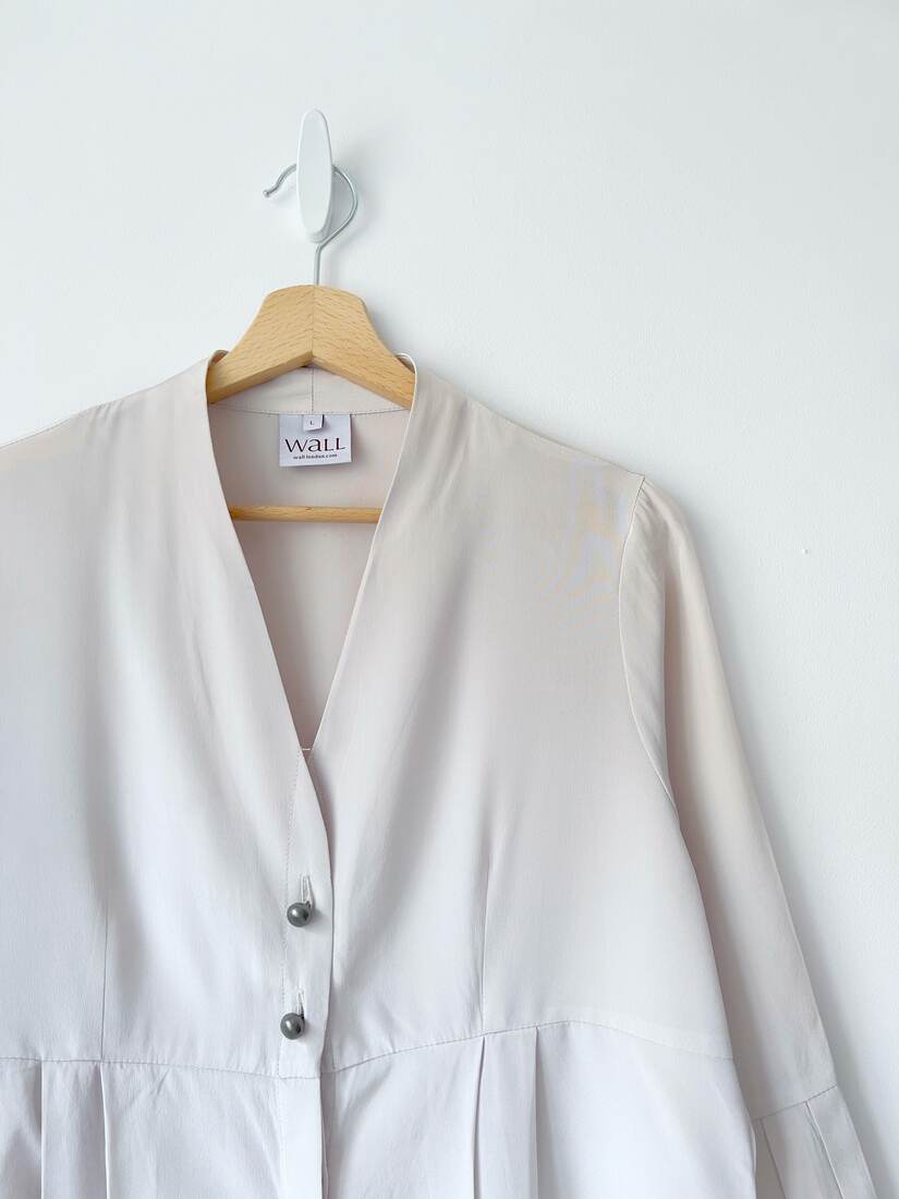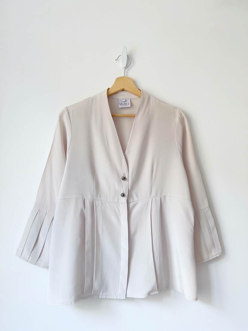 80,00 złJedwabna koszula vintage, zapinana na piękne guziki powlekane jedwabną tkaniną. Rozmiar z metki 8, polecam na XS-S. Pod pachami ma delikatne rozciągnięcia materiału, pokazane na zdjęciach w zbliżeniu. Nie są widoczne w noszeniu. Poza tym bez wad.
