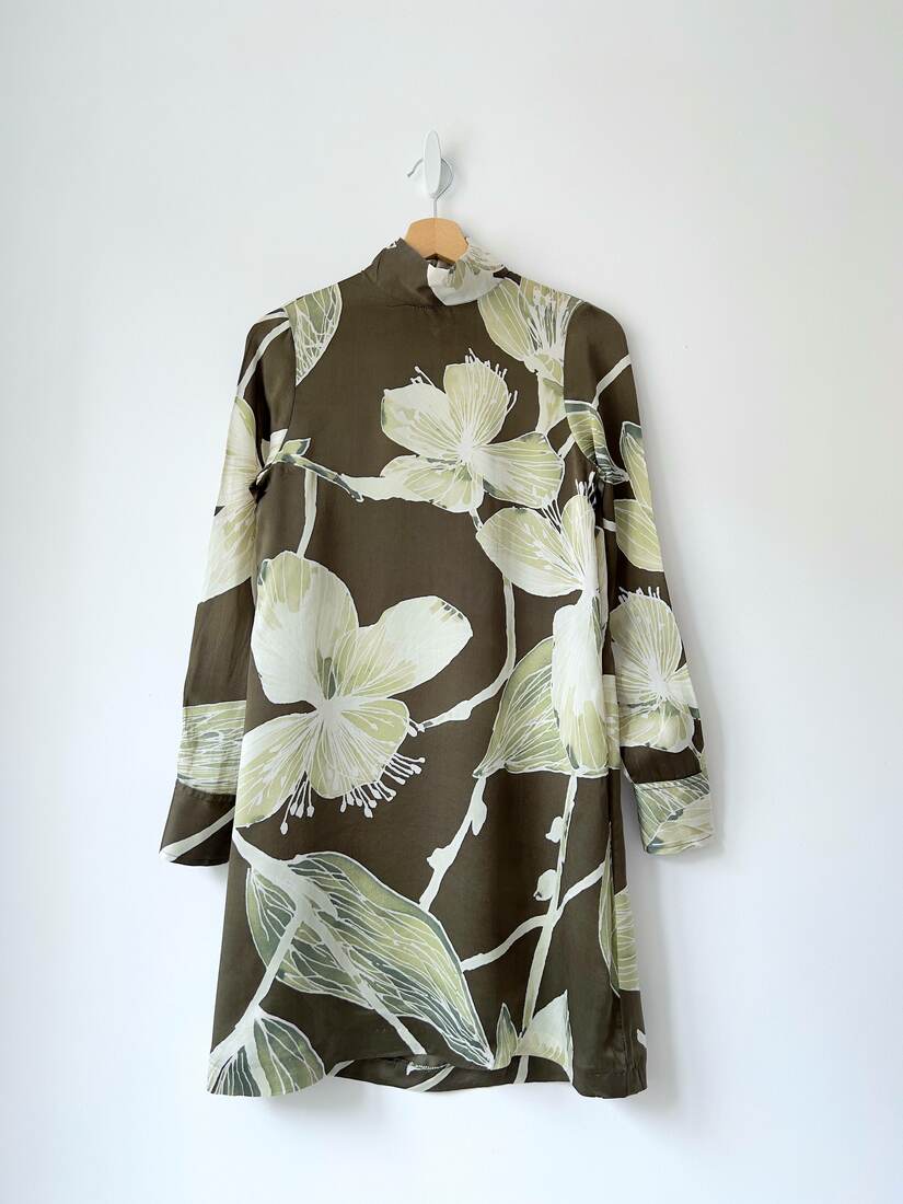 120,00 złJedwabna sukienka o kroju A-line. Bez podszewki. Polecam na rozmiar XS. Pod pachą jest delikatne rozciągnięcie materiału, pokazane na zdjęciu w zbliżeniu. Nie jest widoczne w noszeniu. Poza tym bez wad.