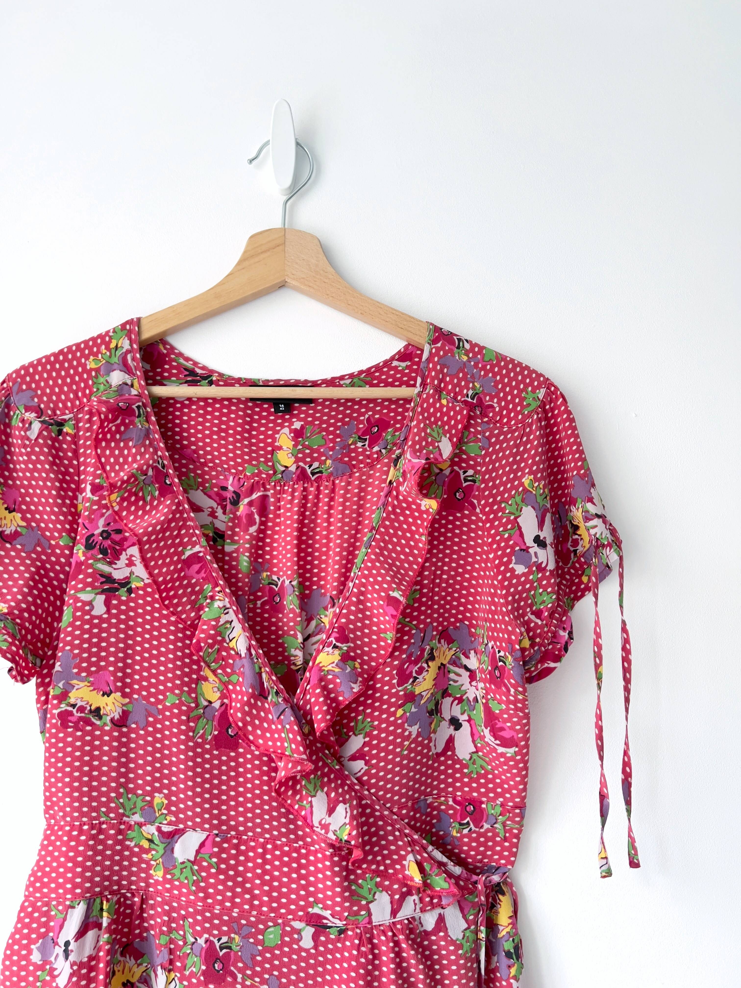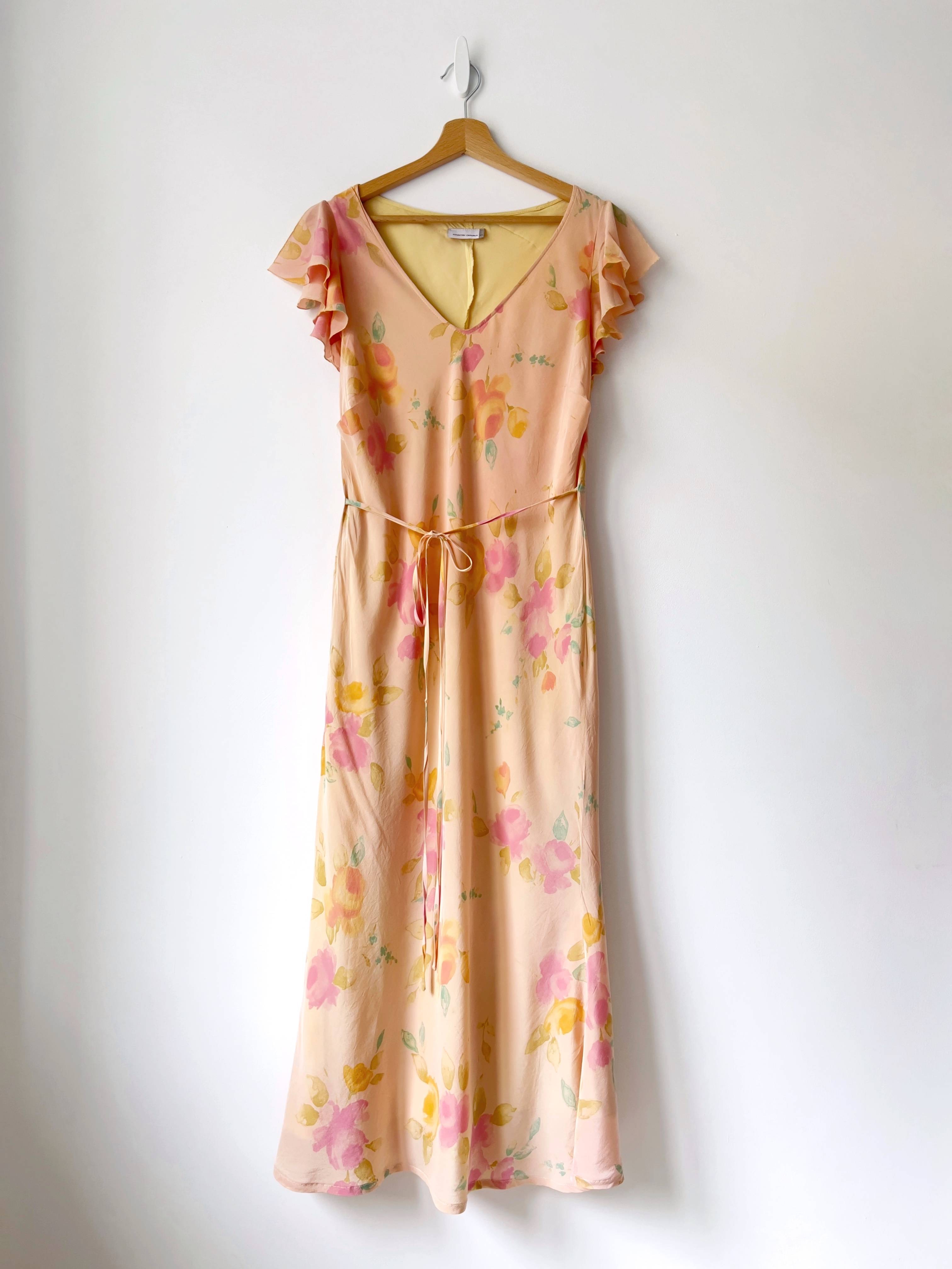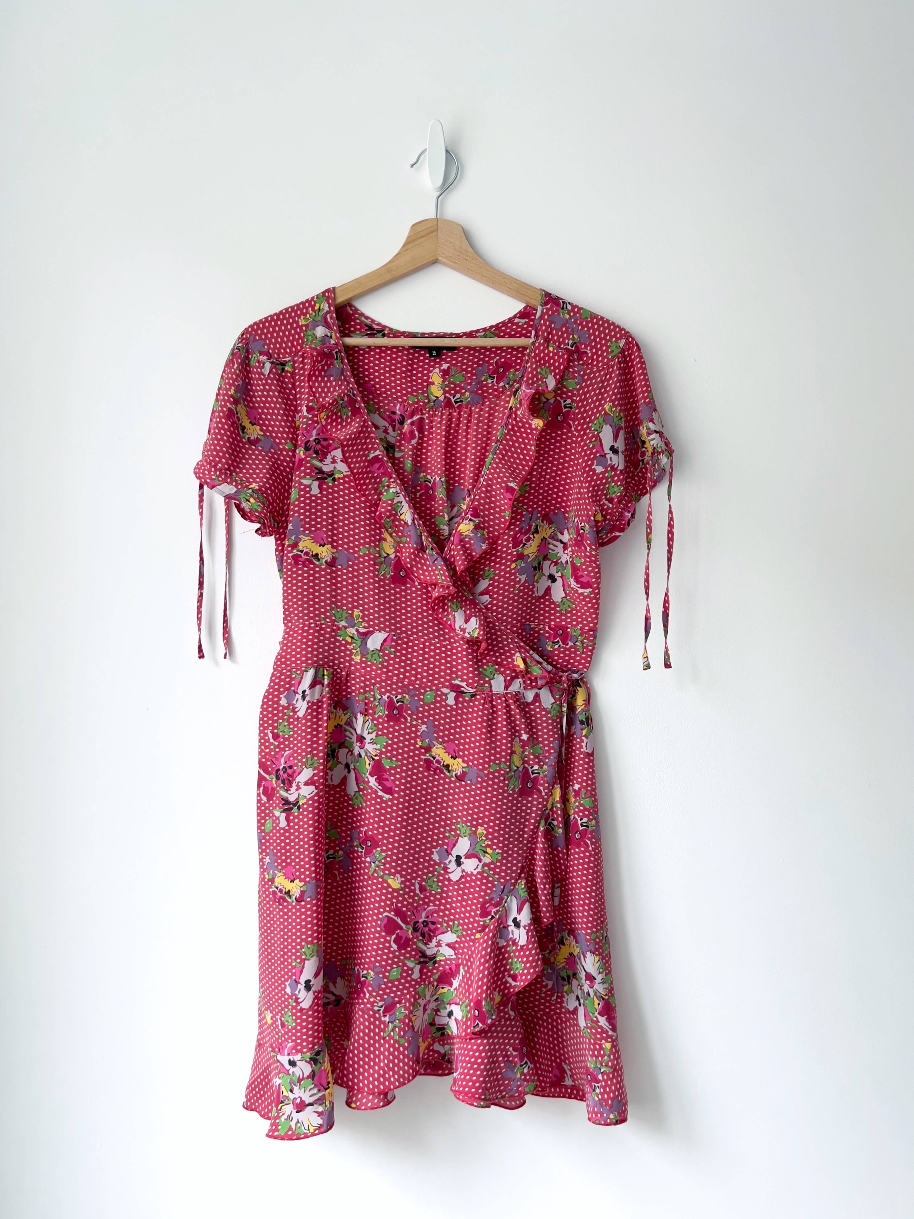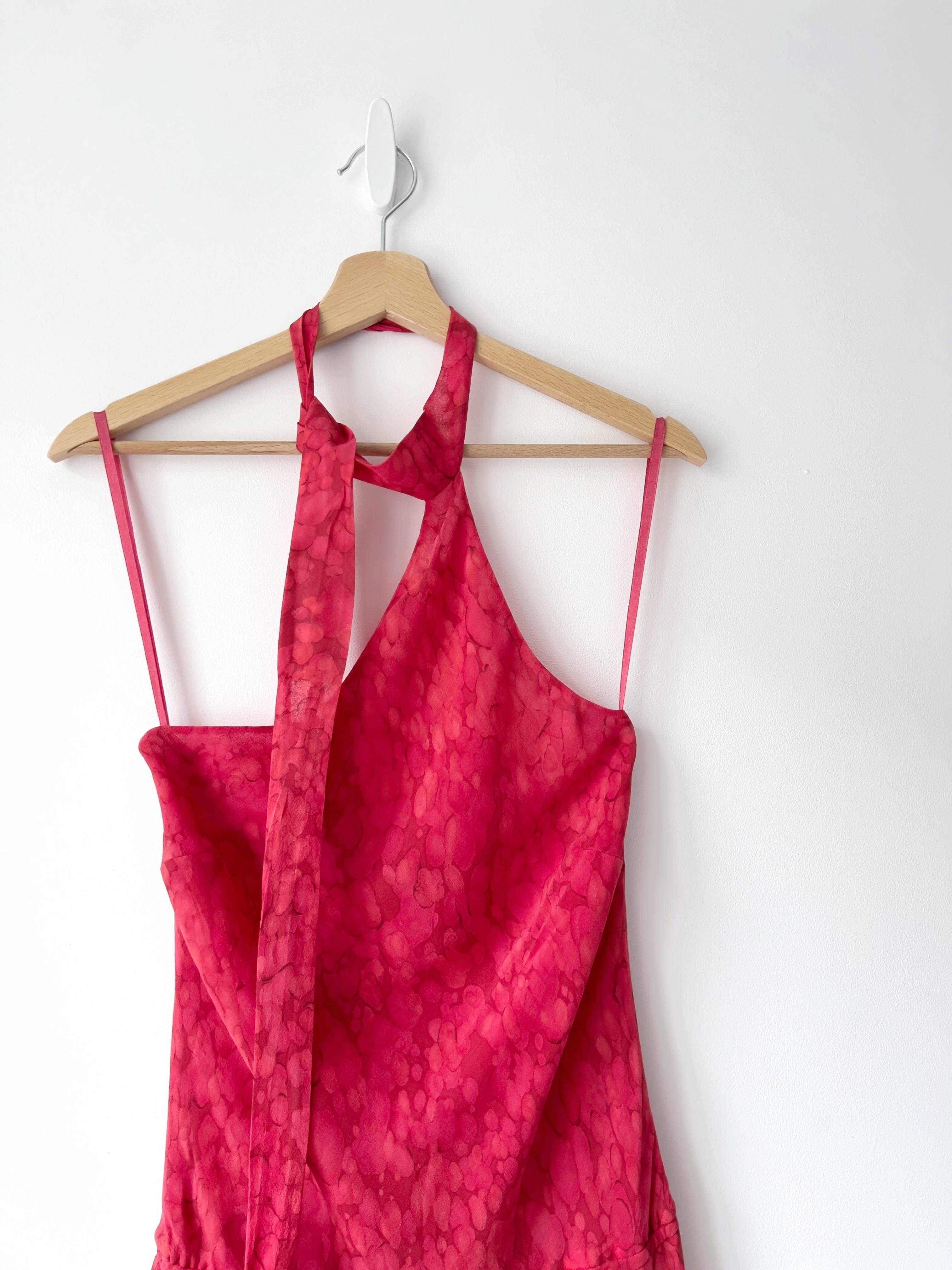 140,00 złJedwabna sukienka z asymetrycznym dekoltem oraz wiązaniem na szyi. Rozmiar z metki 8, w pasie jest gumka, więc polecam na XS-S-mniejsze M. Idealny stan.
