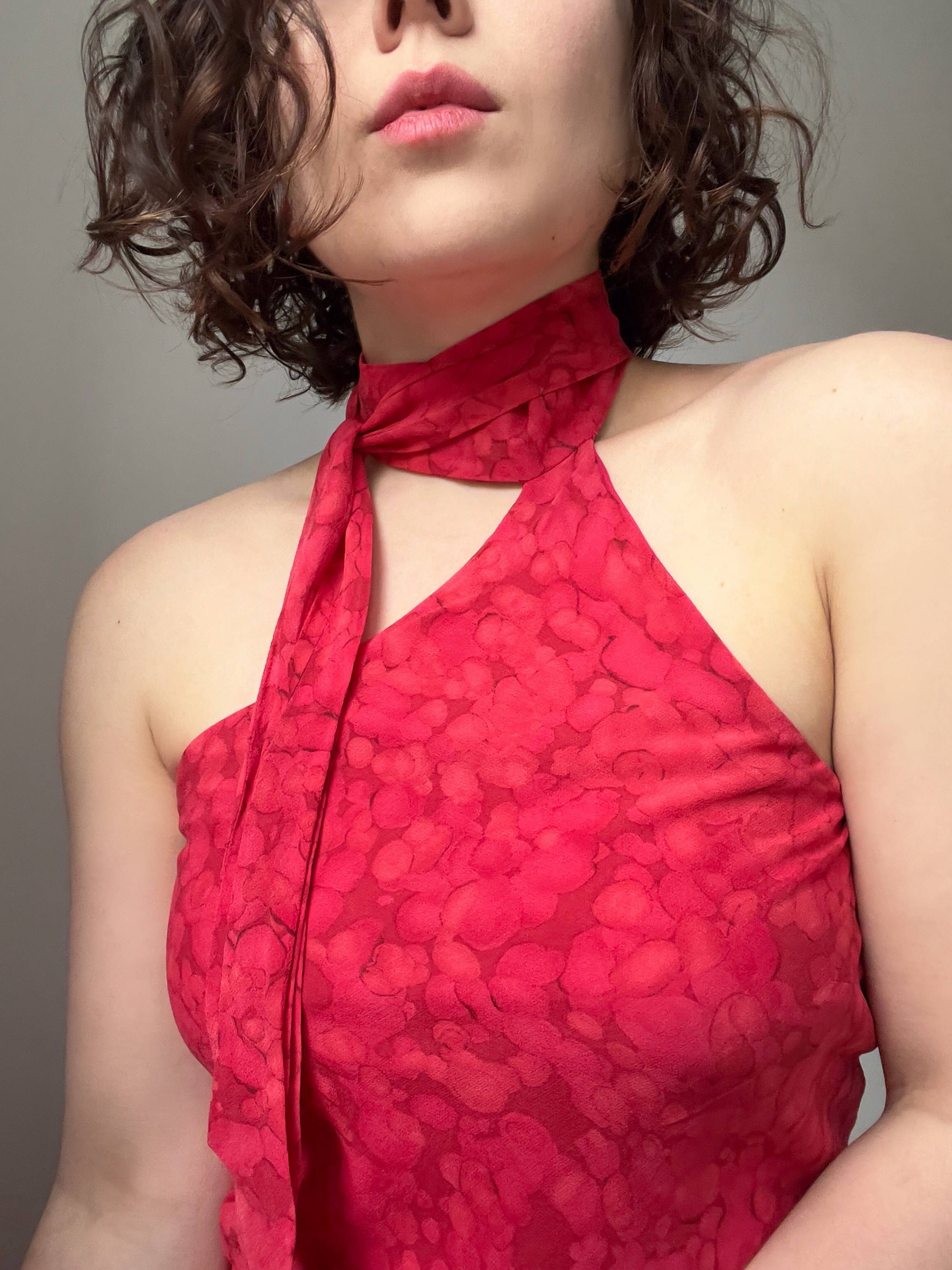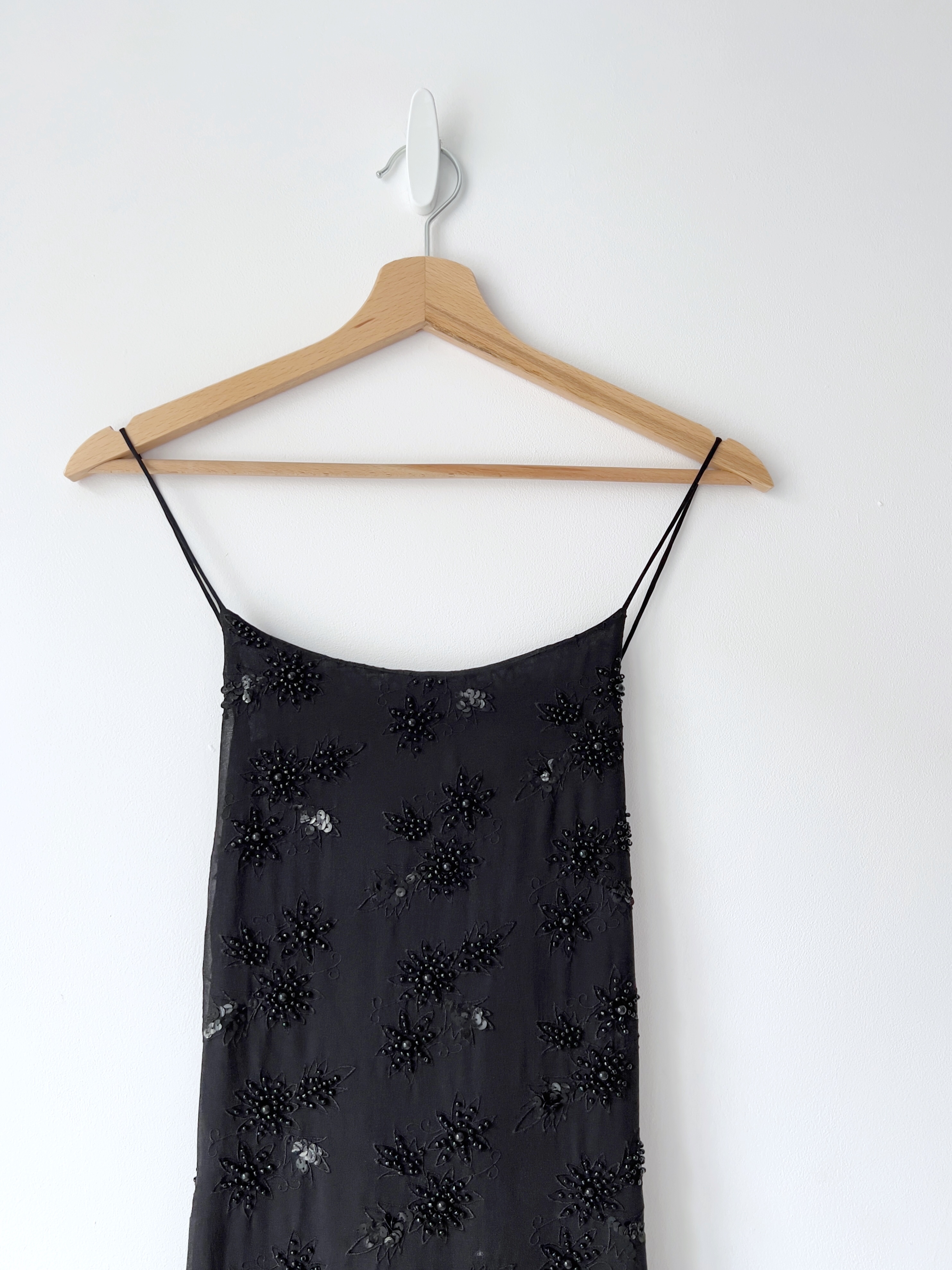 250,00 złUnikatowa sukienka vintage z odkrytymi plecami. W całości wykonana z jedwabiu, również podszewka oraz ramiączka-wiązania na plecach. Zdobiona koralikami oraz cekinami, wszystkie są na miejscu. Zapinana na ukryty boczny zamek. Brak metki z rozmiarem, modelka nosi rozmiar XS-S, sukienka jest nieco za ciasna, więc polecam na XS.