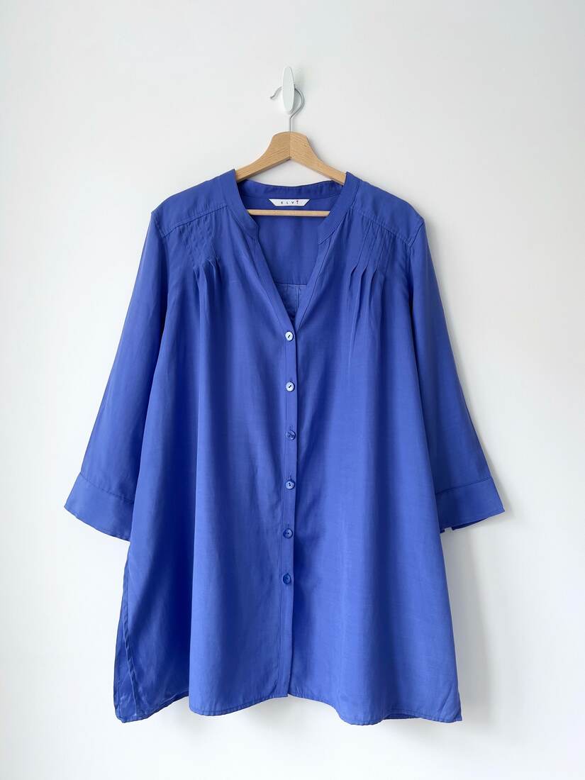 90,00 złKoszula w chabrowym kolorze, wykonana z materiału z dużym dodatkiem jedwabiu. Marka Elvi, specjalizująca w produkcji ubrań dla osób Plus Size. Rozmiar z metki 22, bez wad.