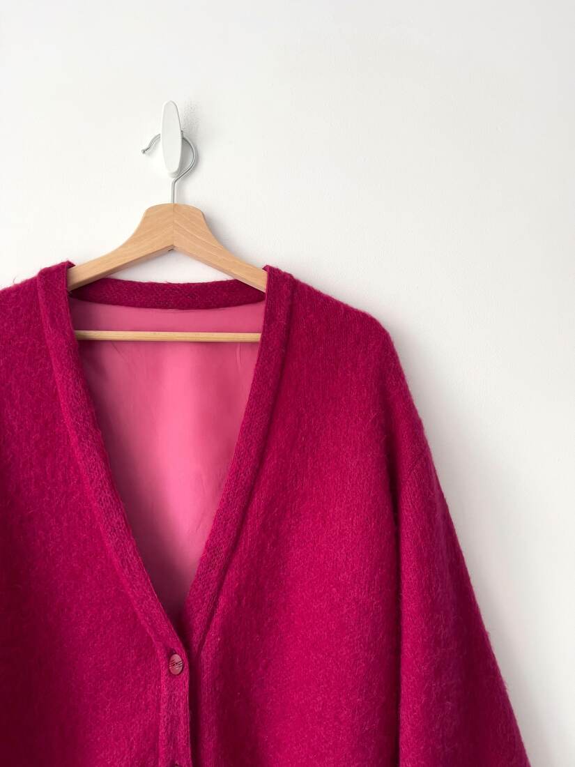 Sweter o luźnym kroju, z mega bufiastymi rękawami. Brak metki ze składem, jest to moher. Sweter ma podszewkę i może być noszony jako kurtka. Zależnie od preferowanego dopasowania będzie pasować na S-M-L. Bardzo dobry stan.
