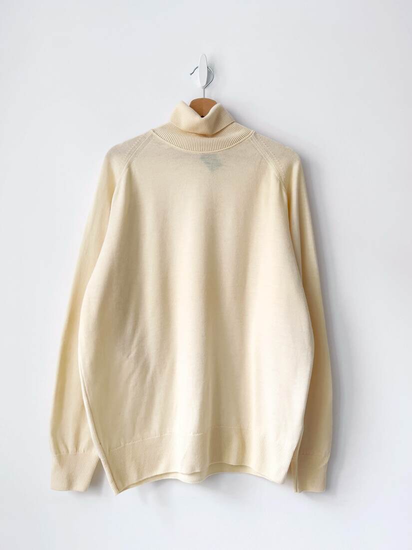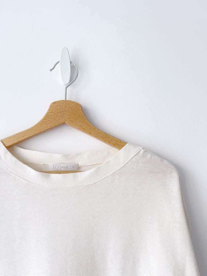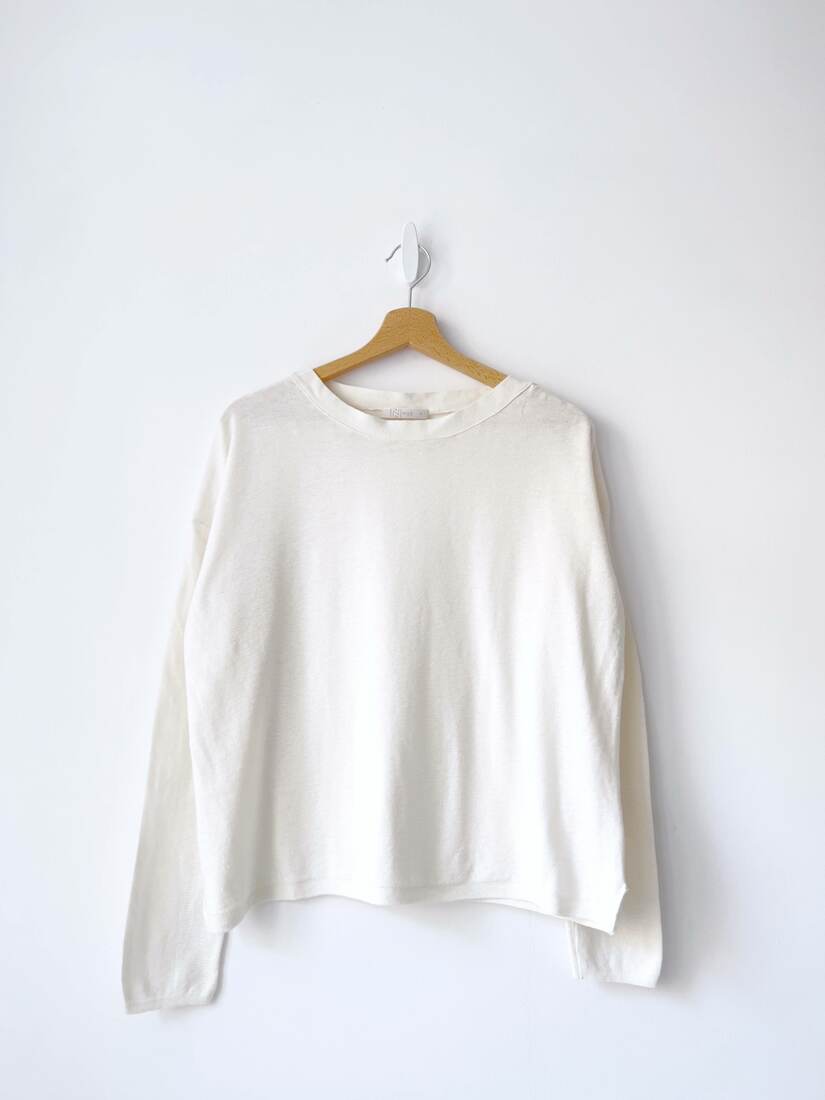 Cienki sweterek o luźnym kroju. Wykonany z bawełny z dodatkiem jedwabiu. Rozmiar z metki M, będzie pasować również na L. Bardzo dobry stan.