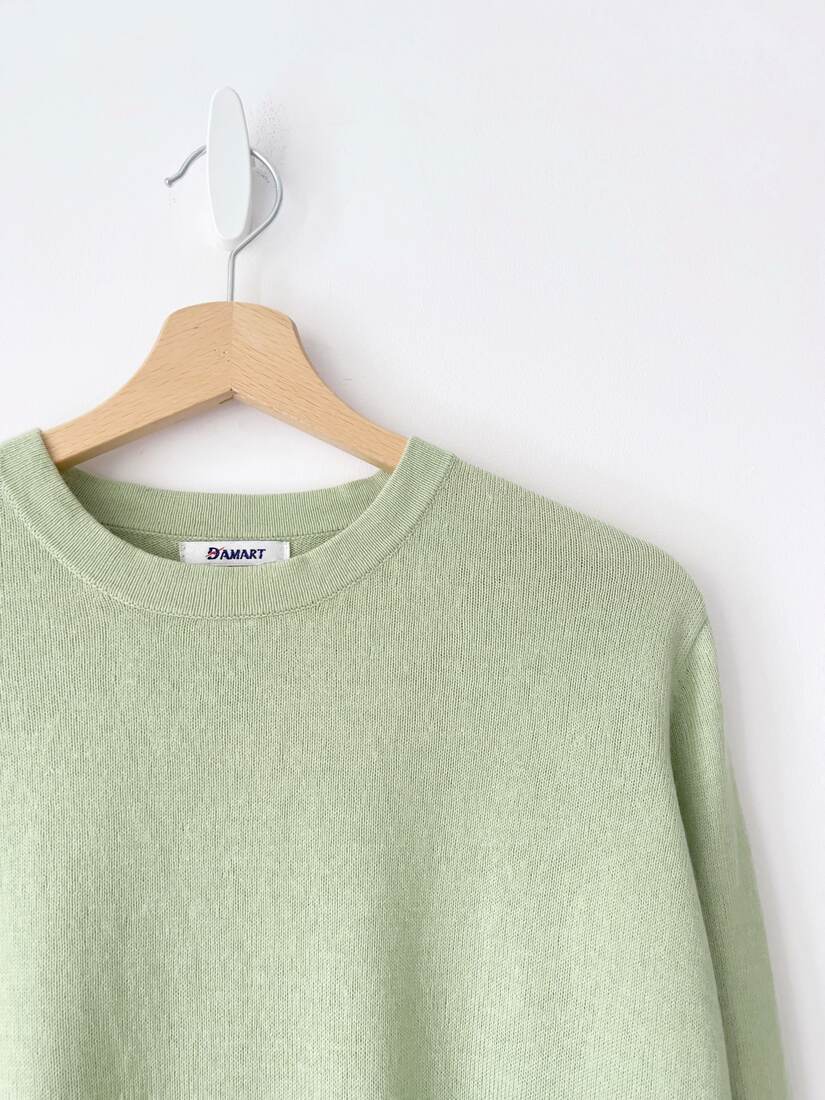 Sweter vintage w pistacjowym kolorze. Wykonany z miłej w dotyku mieszanki jedwabiu oraz kaszmiru. Polecam na L, bardzo dobry stan.