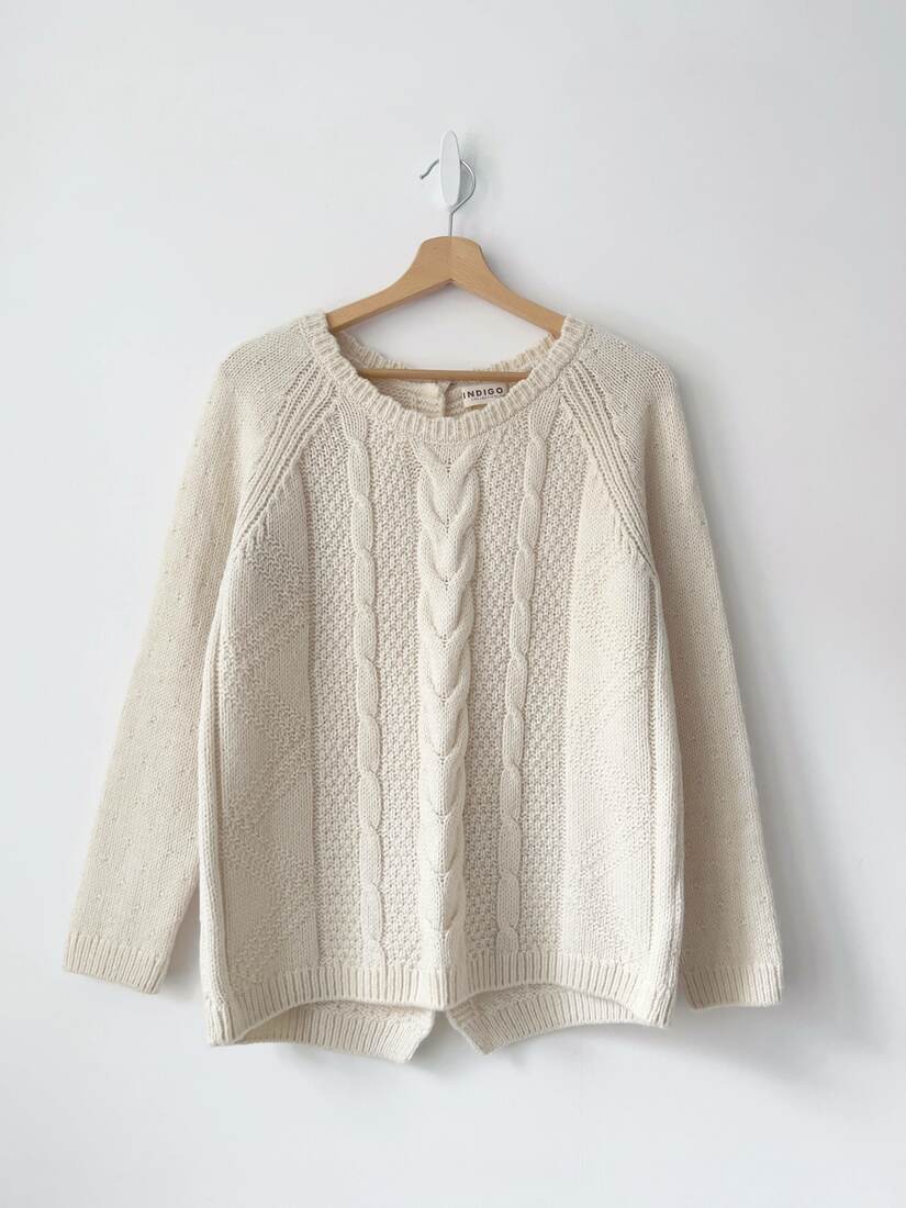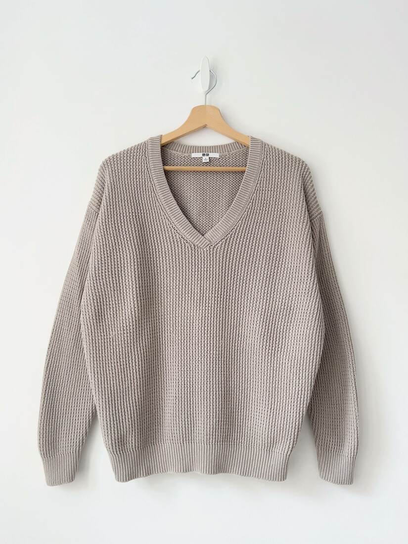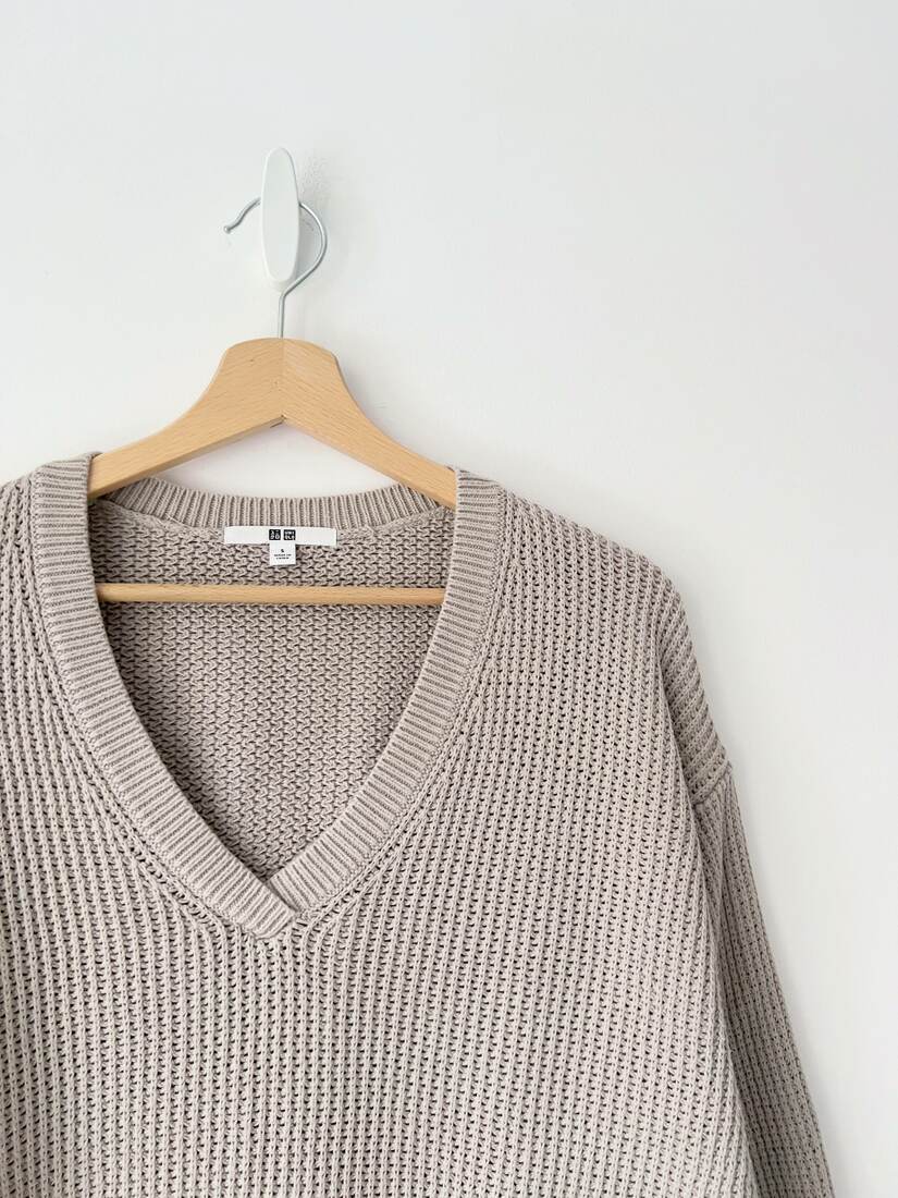 Szarobeżowy sweter marki Uniqlo. W 100% wykonany z bawełny. Rozmiar z metki S, fason jest dość luźny, więc będzie pasować również na większe. Bez wad.