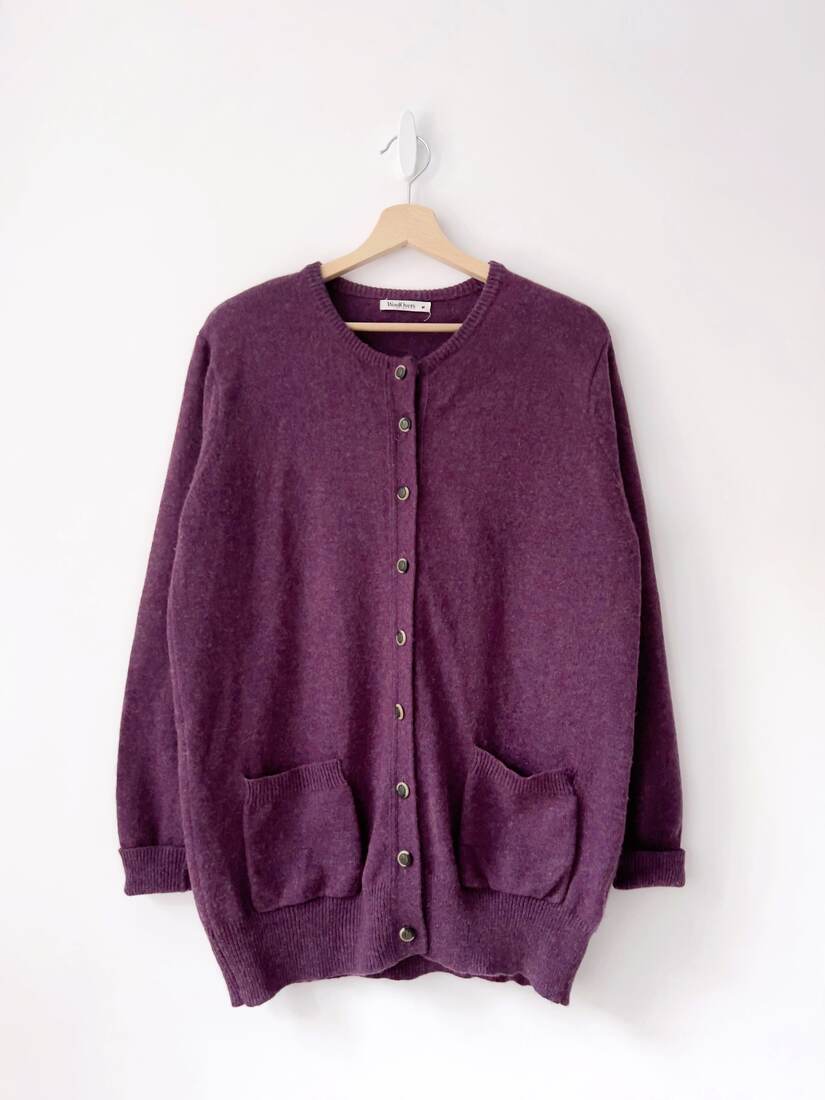 Kardigan w śliwkowym kolorze, brytyjska marka WoolOvers. W 100% wykonany z wełny. Rozmiar z metki M, dość luźny fason. Bardzo dobry stan.