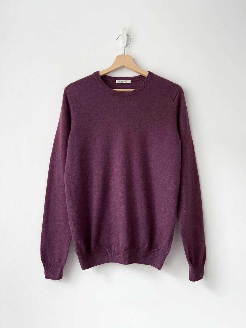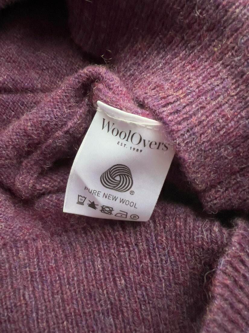 Sweter w śliwkowym kolorze, brytyjska marka WoolOvers. W 100% wykonany z wełny merynosa, bardzo miękki i miły w dotyku. Rozmiar z metki M, bez wad.