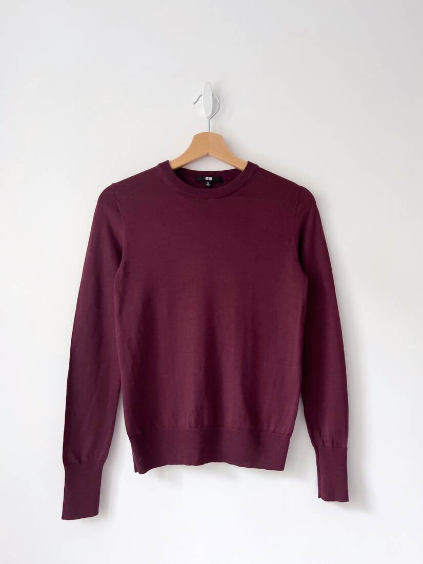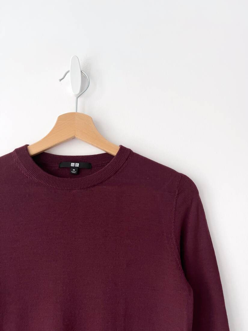 Bordowy sweterek basic, w 100% wykonany z dziewiczej wełny. Marka Uniqlo. Rozmiar z metki XS, bardzo dobry stan.
