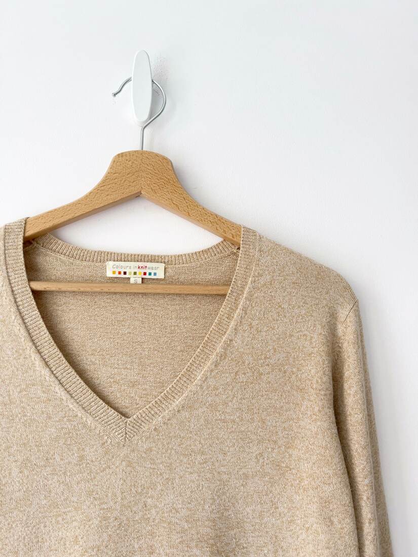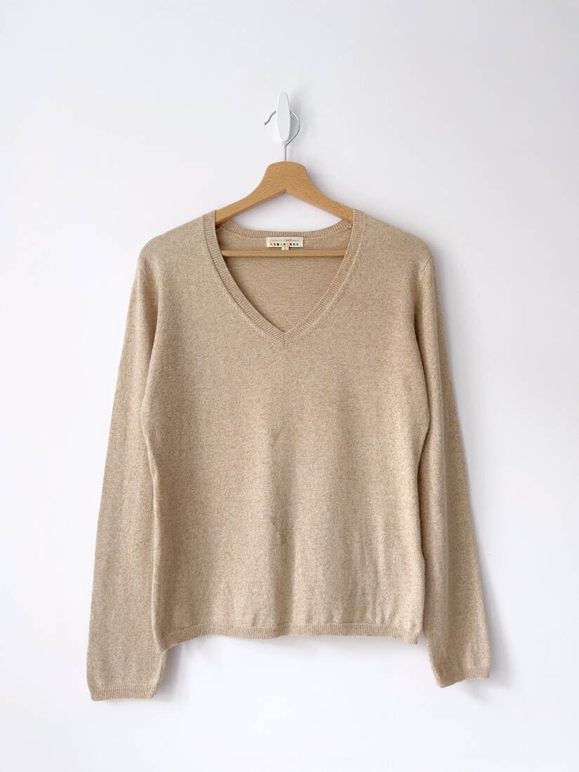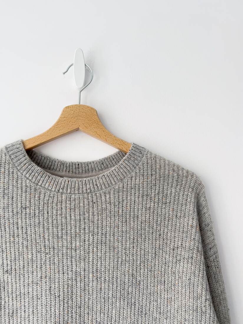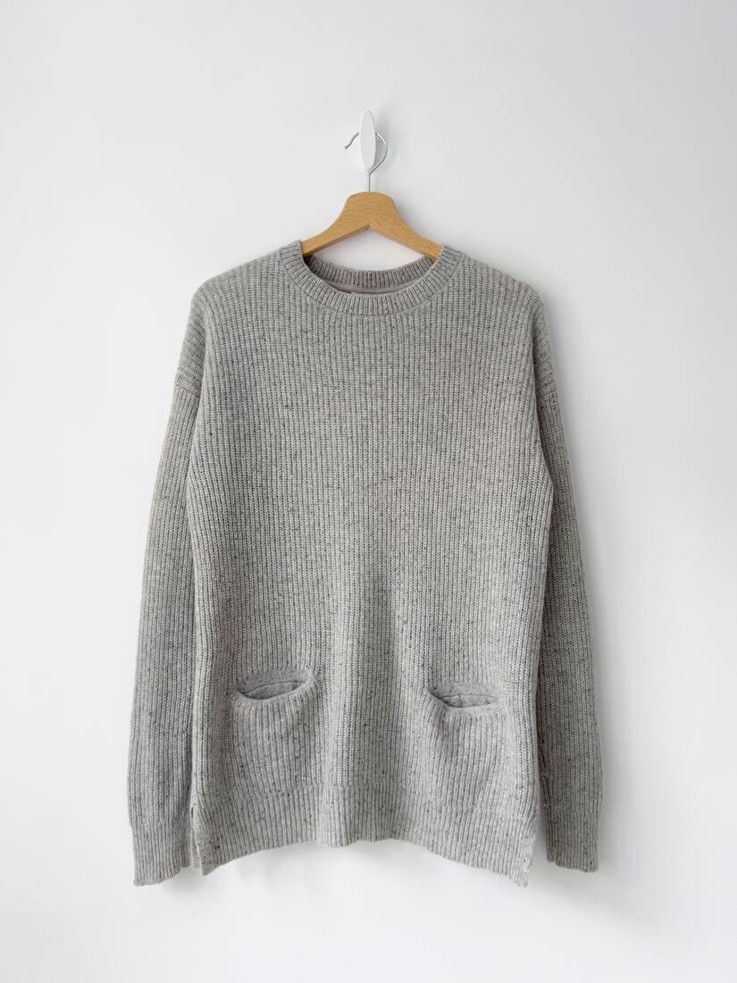 Mięciutki kaszmirowy sweter w kolorze szarego melanżu. Rozmiar z metki 14, bardzo dobry stan.