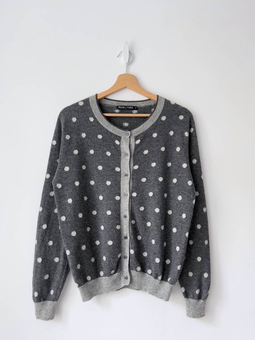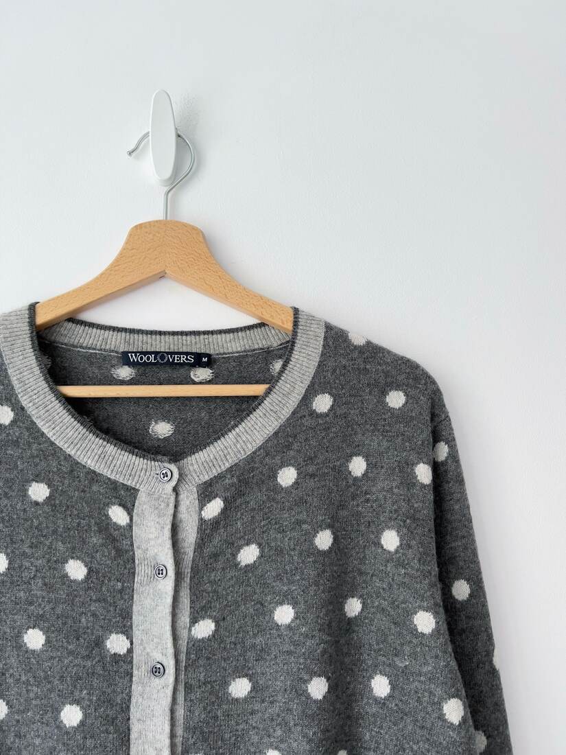 Kardigan brytyjskiej marki WoolOvers. Wykonany z mięciutkiej mieszanki wełny z merynosa oraz kaszmiru. Rozmiar z metki M, bez wad.