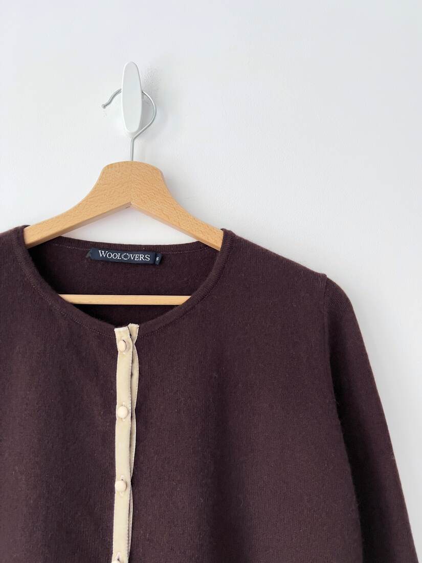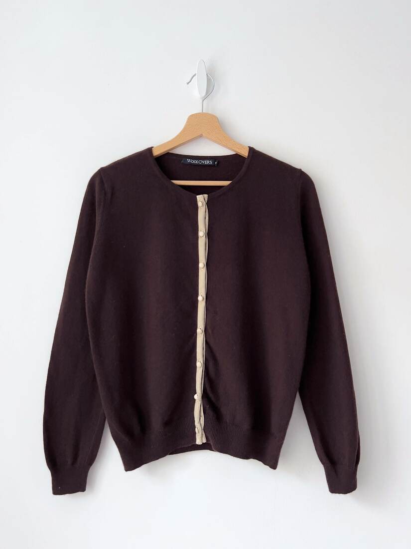 Kardigan brytyjskiej marki WoolOvers. Wykonany z mięciutkiej mieszanki wełny z merynosa oraz kaszmiru. Rozmiar z metki S, bez wad.