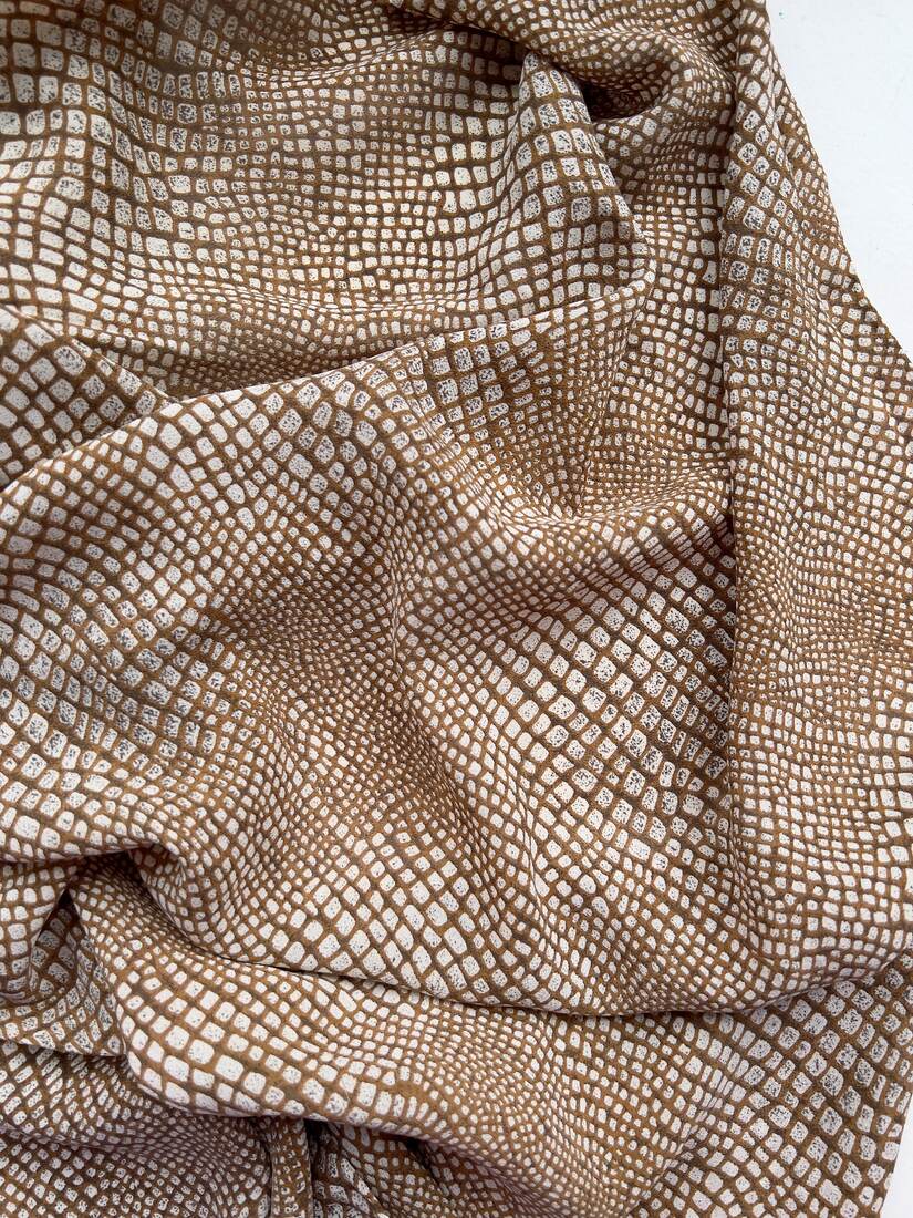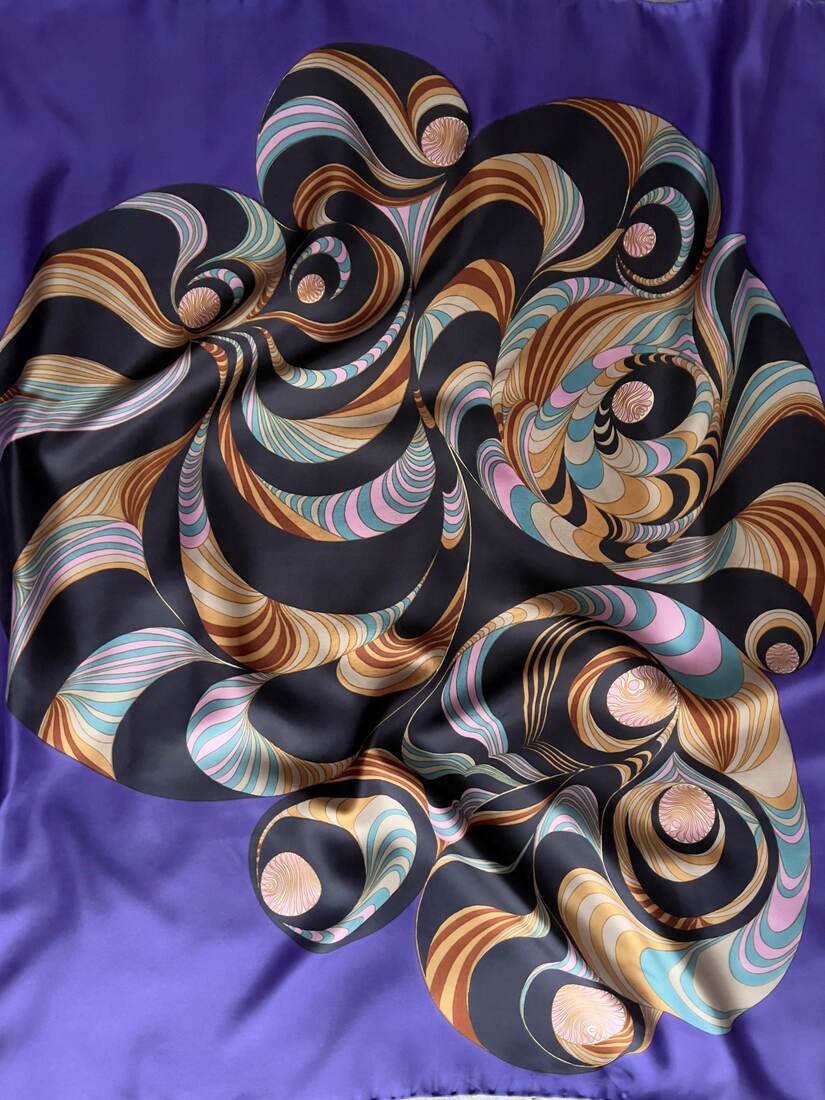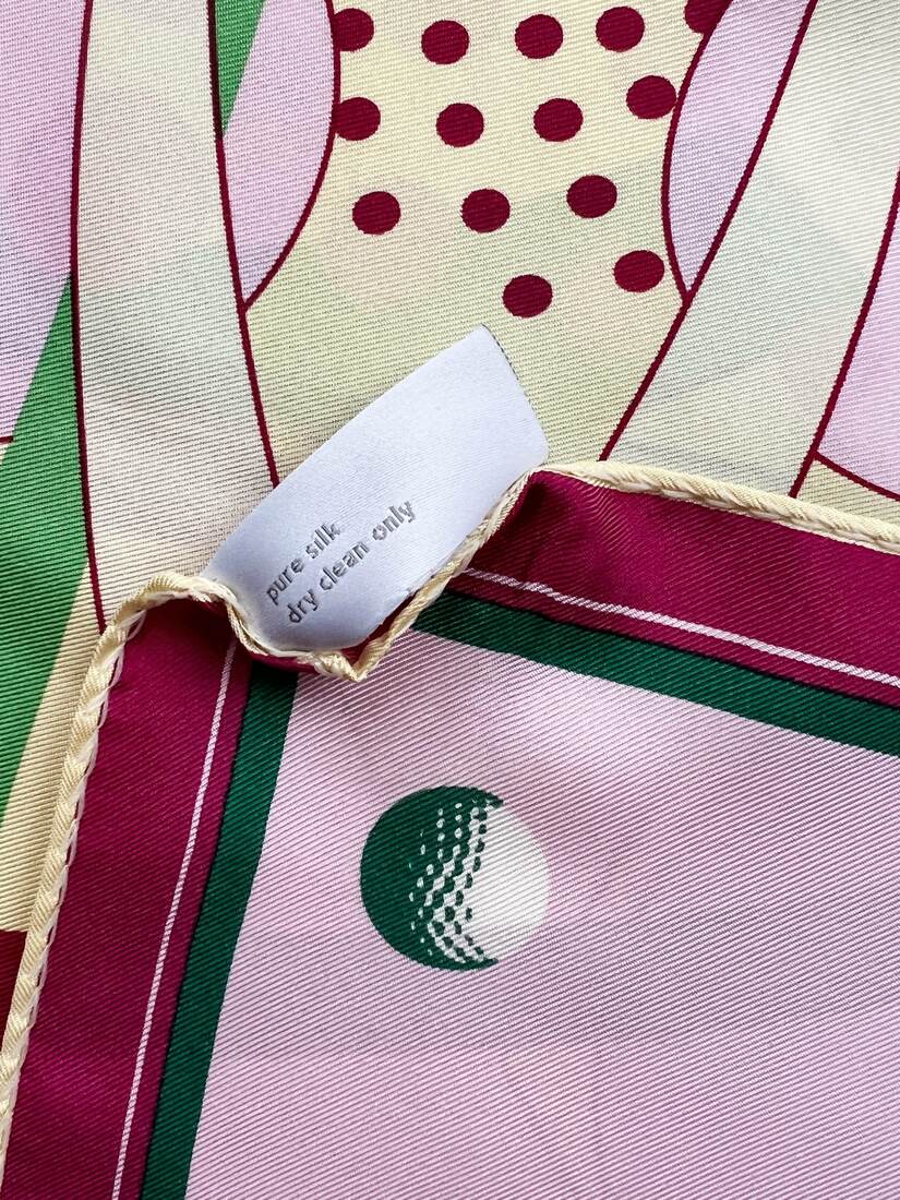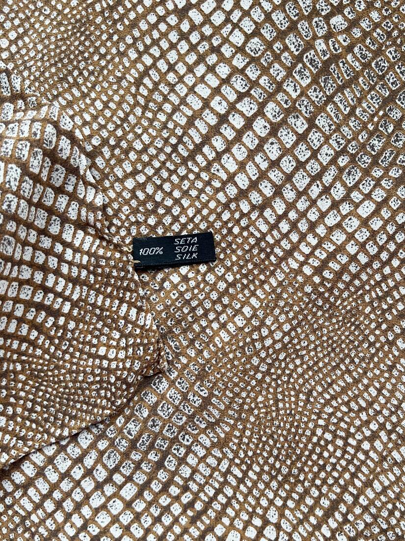 Duża jedwabna apaszka we wzory. Model vintage francuskiego projektanta Jean Patou. Wykonana z gęstego jedwabiu, ręcznie rolowana. Bardzo dobry stan.