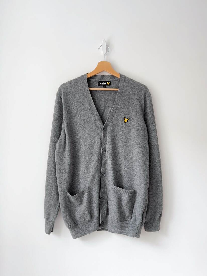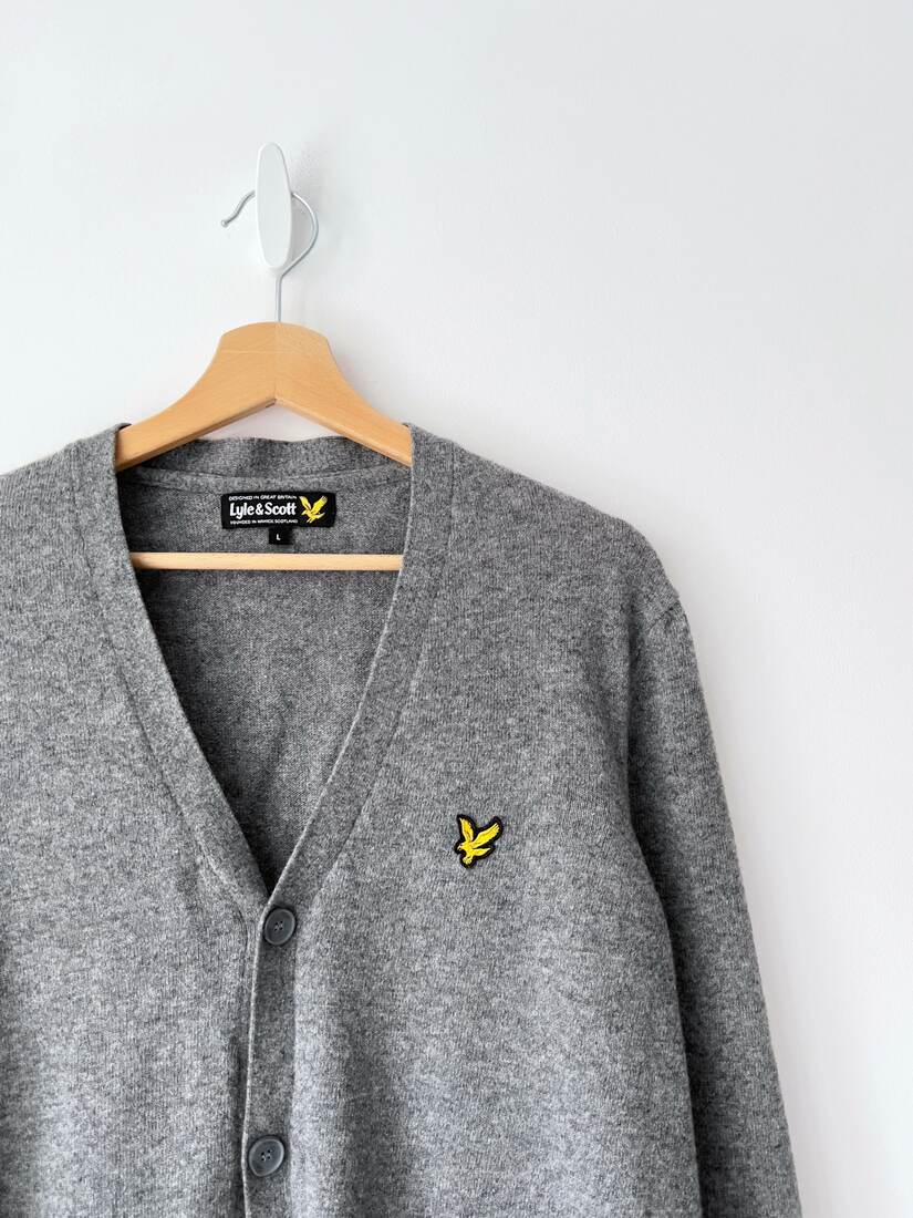 Wełmiany kardigan szkockiej marki Lyle and Scott. Rozmiar z metki L, bez wad.
