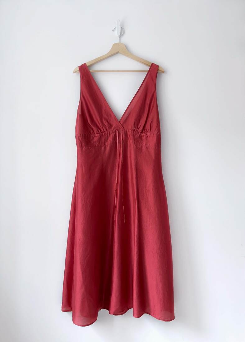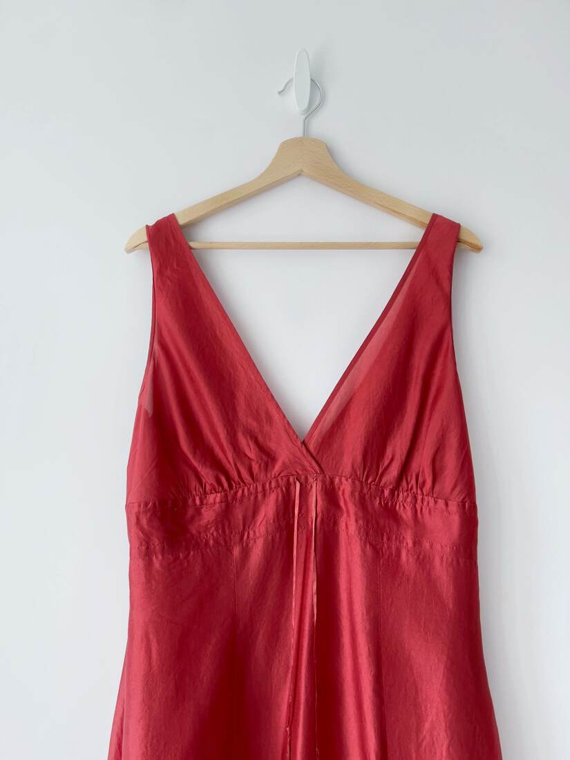 Lekka jedwabna sukienka w kolorze koralowym. Bez podszewki, pod biustem regulowana troczkiem, zapinana na ukryty boczny zamek. Brak metki z rozmiarem, polecam na r.L. Bez wad.
