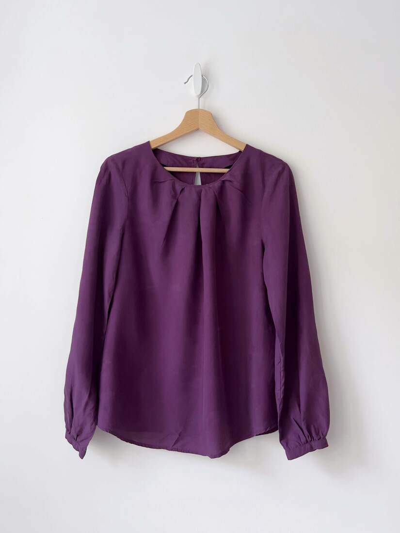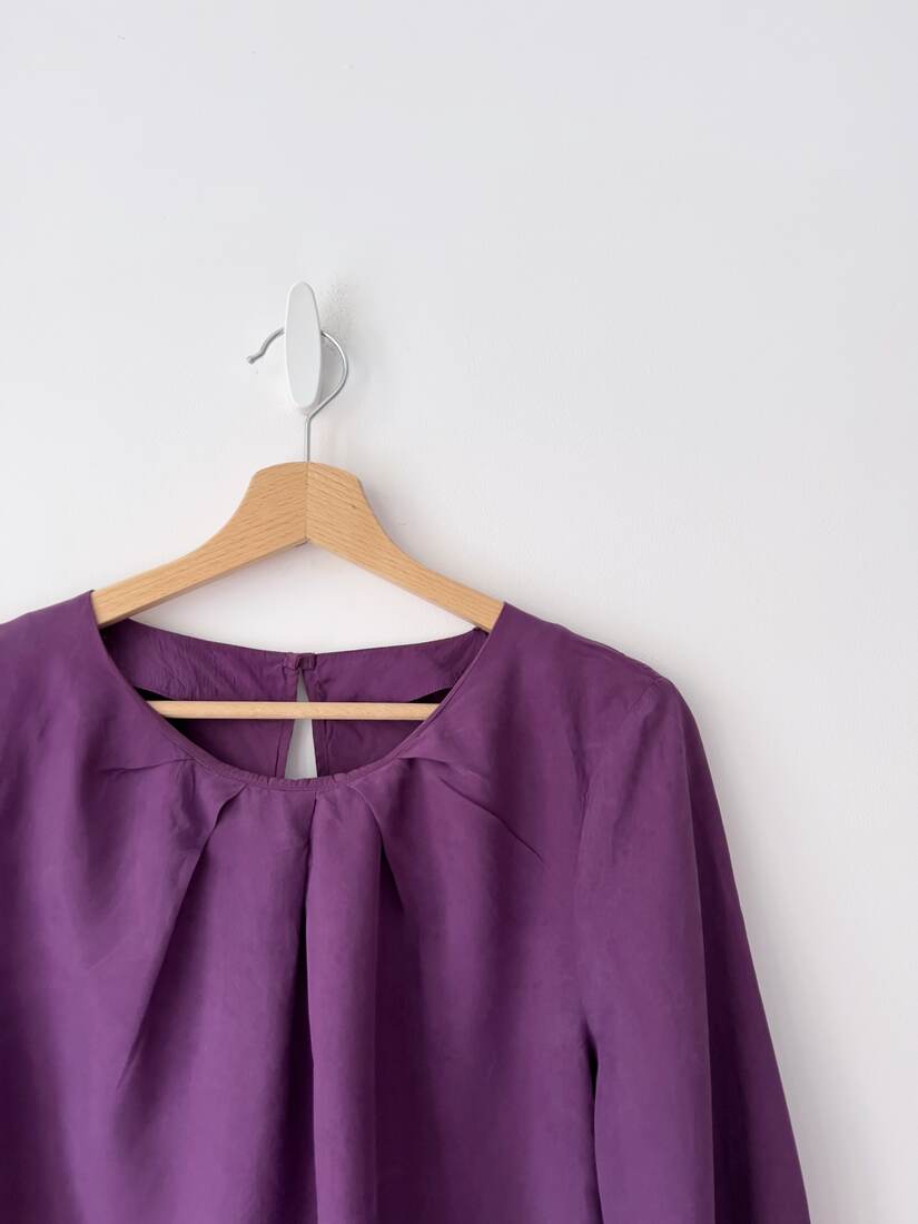 Jedwabna koszula z zaszewkami na dekolcie oraz małym rozpięciem z tyłu. Brak metki z rozmiarem. Bardzo dobry stan.