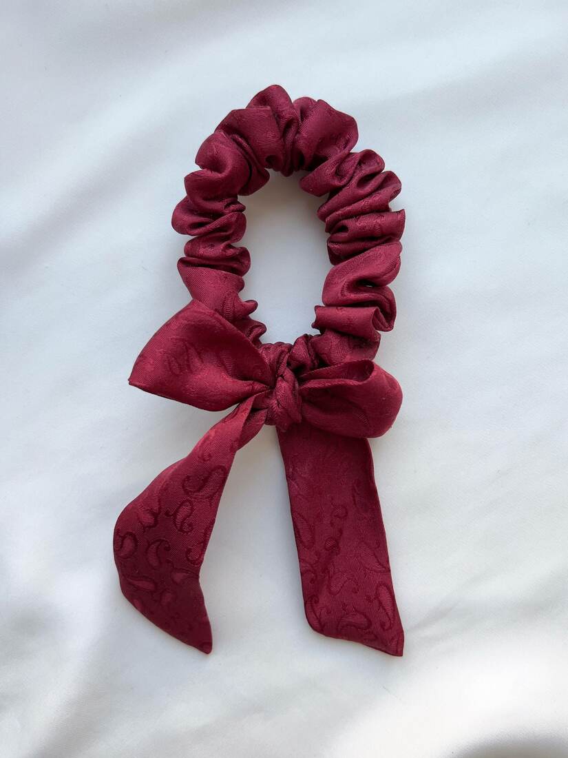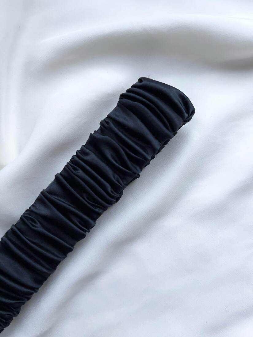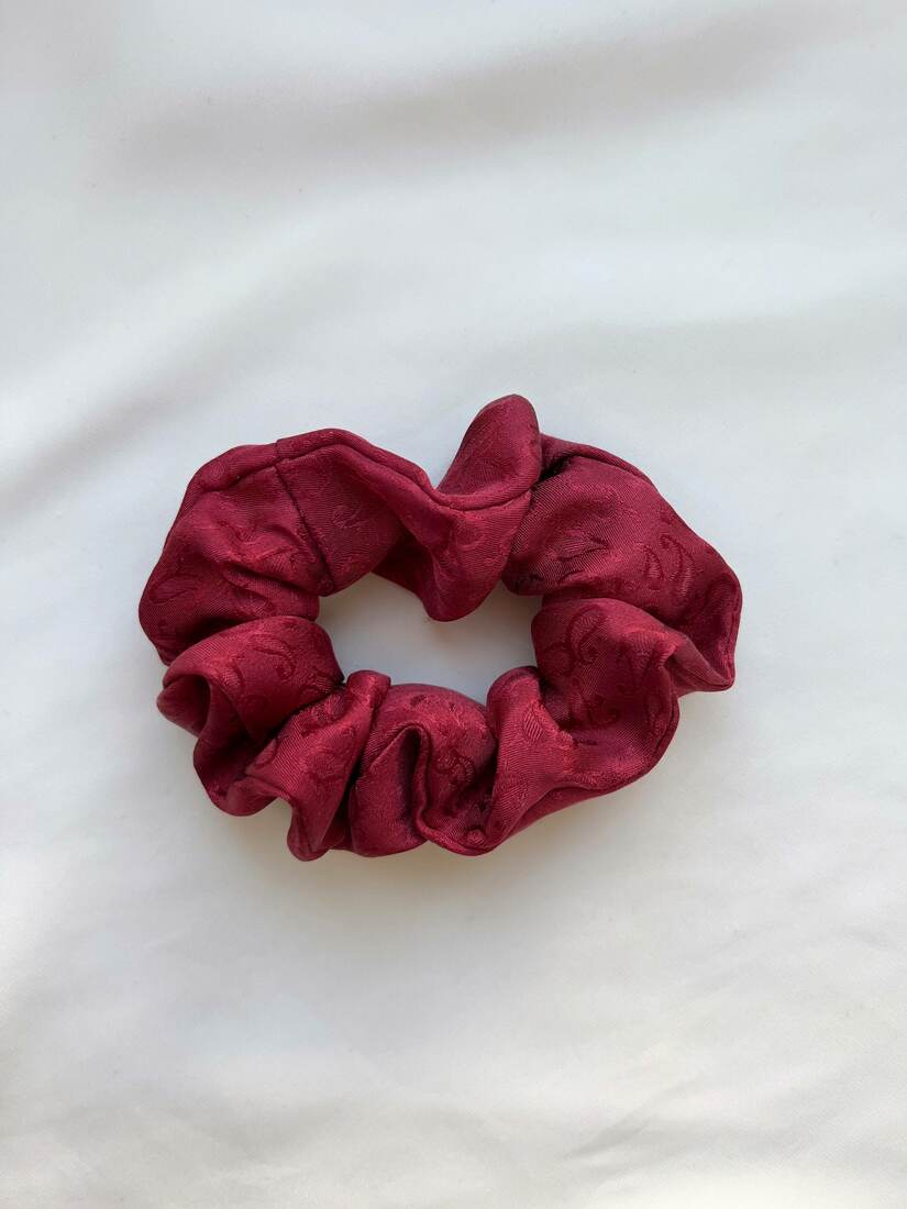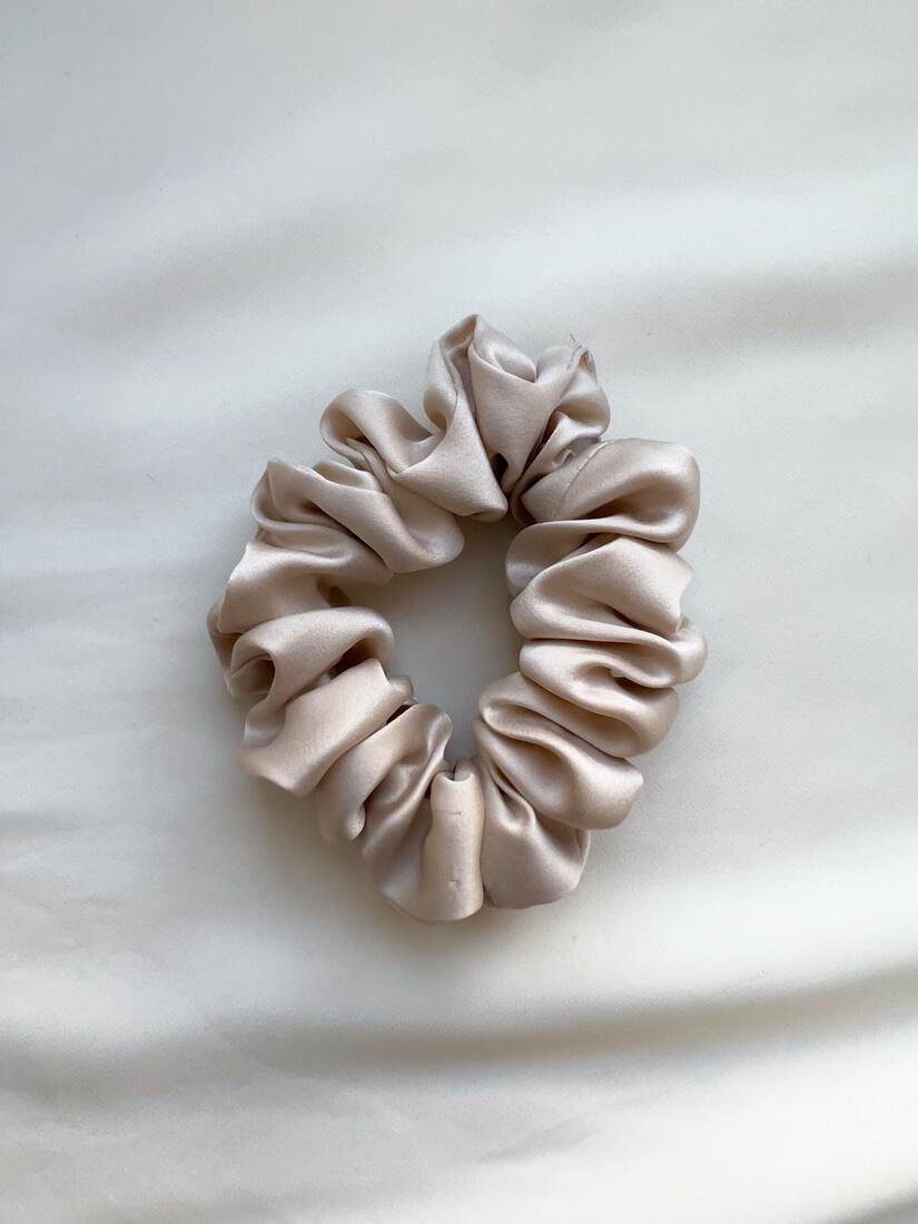 Jedwabna gumka do włosów szyta z materiału z recyklingu. 100% jedwab, średnica: około 10 cm.