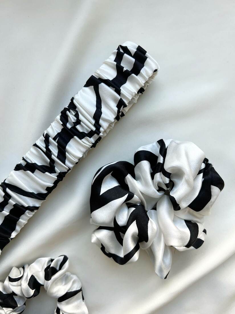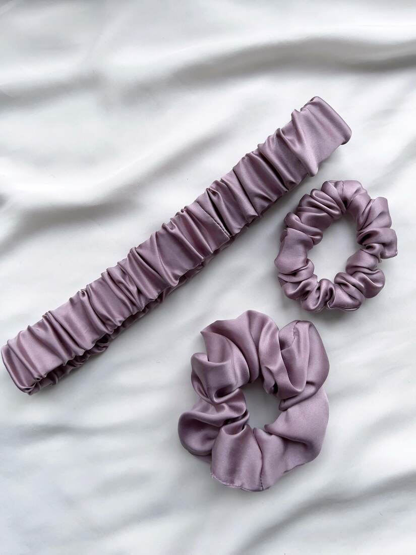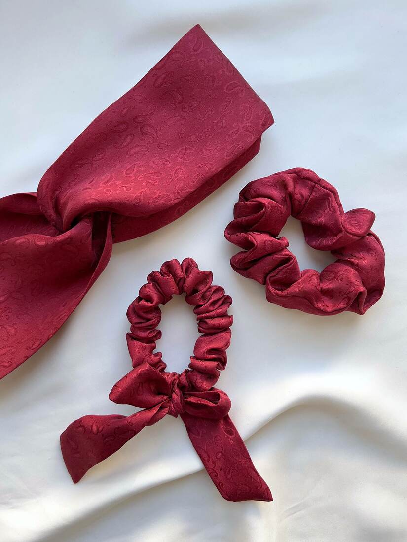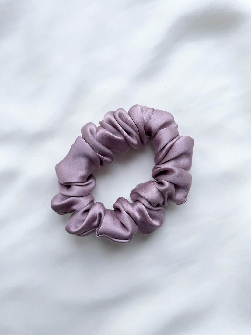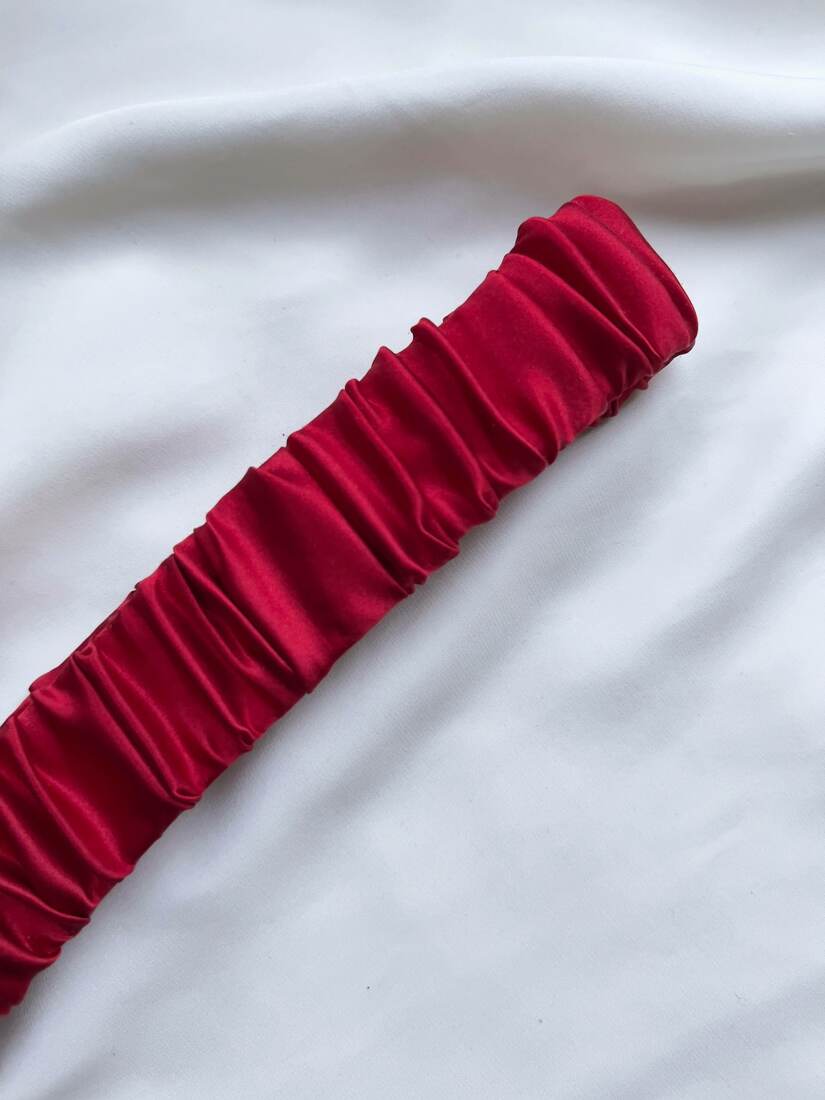 Jedwabna gumka do włosów szyta z materiału z recyklingu. 100% jedwab, średnica: około 10 cm.
