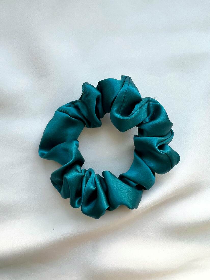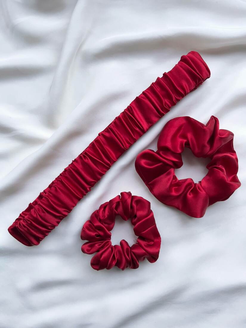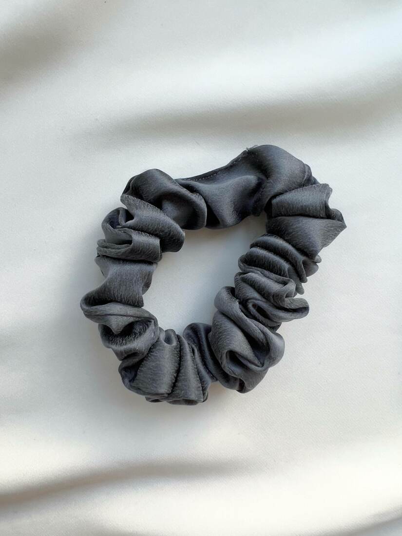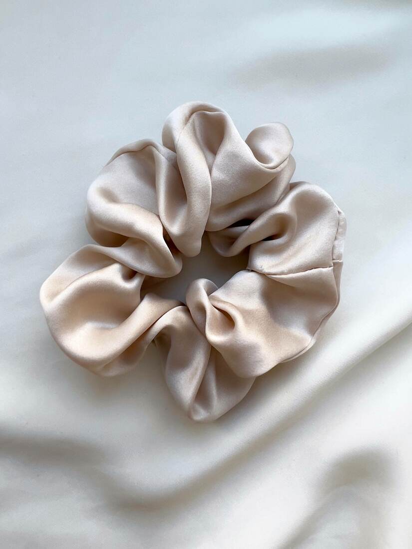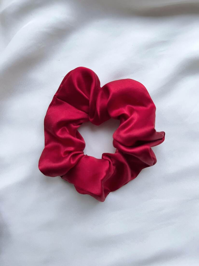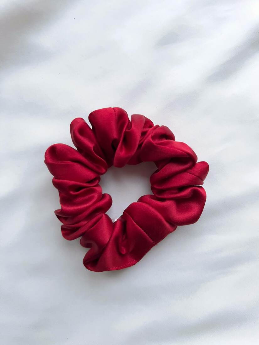 Jedwabna gumka do włosów szyta z materiału z recyklingu. 100% jedwab, średnica: około 10 cm.