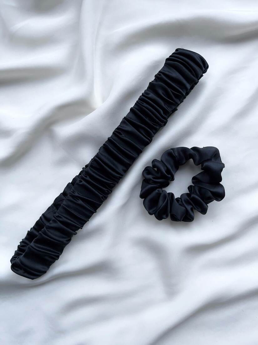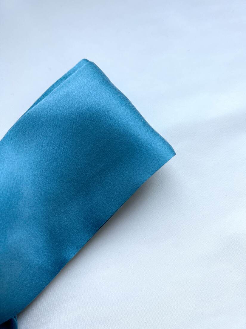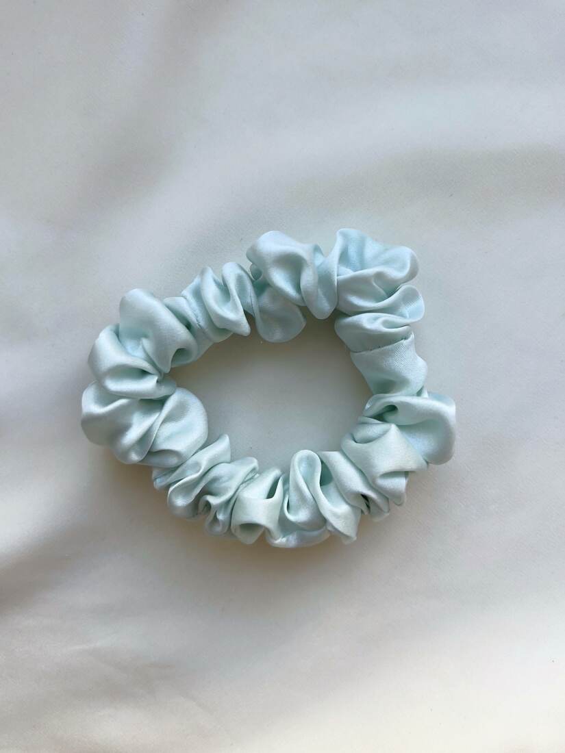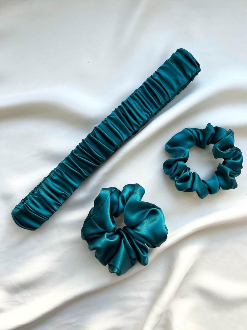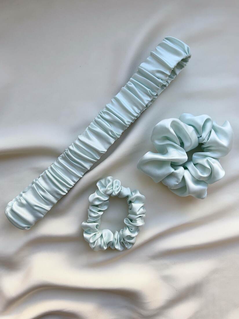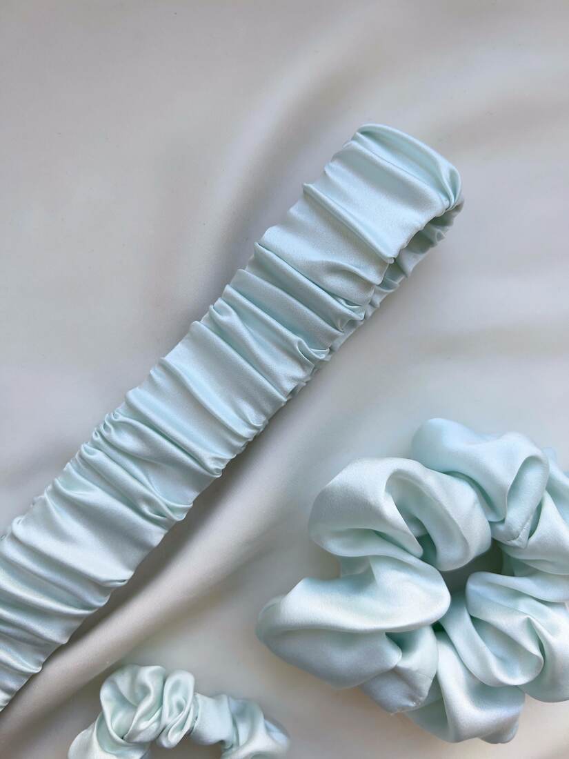 Jedwabna gumka do włosów szyta z materiału z recyklingu. 100% jedwab, średnica: około 10 cm.