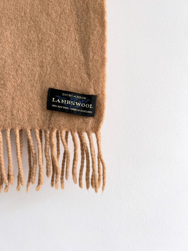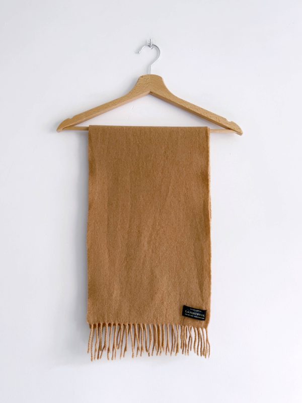 Karmelowy szalik vintage, w 100% wykonany z wełny jagnięcej. Jest delikatnie sfilcowany, nie jest to widoczne i nie przeszkadza w noszeniu. Poza tym bez wad.