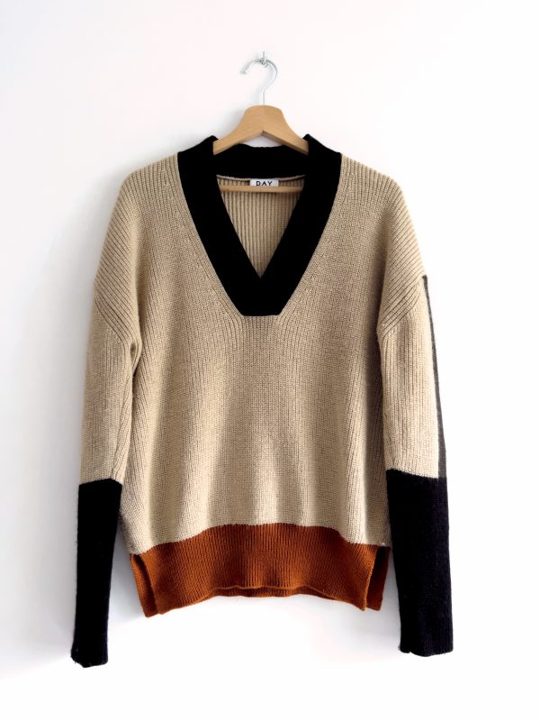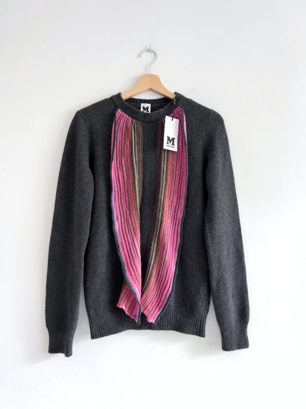 140,00 złSweter luksusowej włoskiej marki Missoni, cena z metki 690 euro. Wykonany z miłej w dotyku wełny z dodatkiem angory. Sweter jest nowy, jednak ma małe cerowanie pokazane na zdjęciu. Nie jest ono zauważalne, myślę że można naprawić żeby było zupełnie nie widoczne. Poza tym bez wad. Rozmiar z metki włoskie 44, polecam na M.