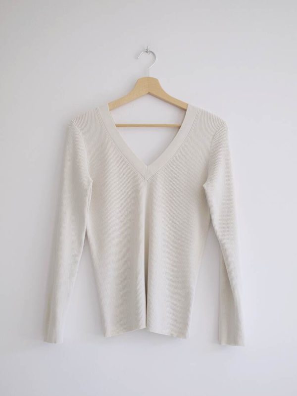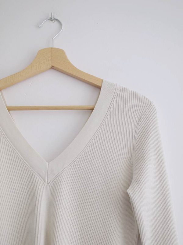 Bluzka w prążki w kolorze złamanej bieli. Wykonana z jedwabnej dzianiny z małym dodatkiem poliamidu oraz elastanu. Polecam na S-M. Bardzo dobry stan.