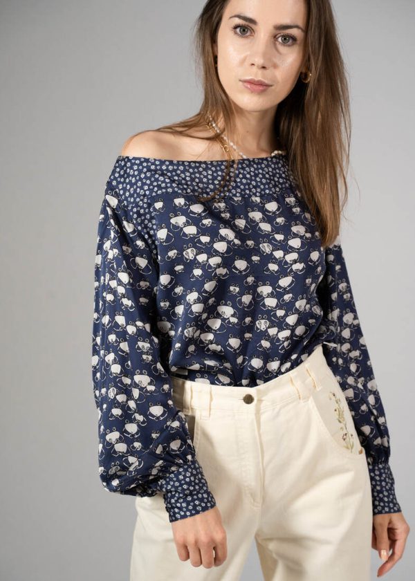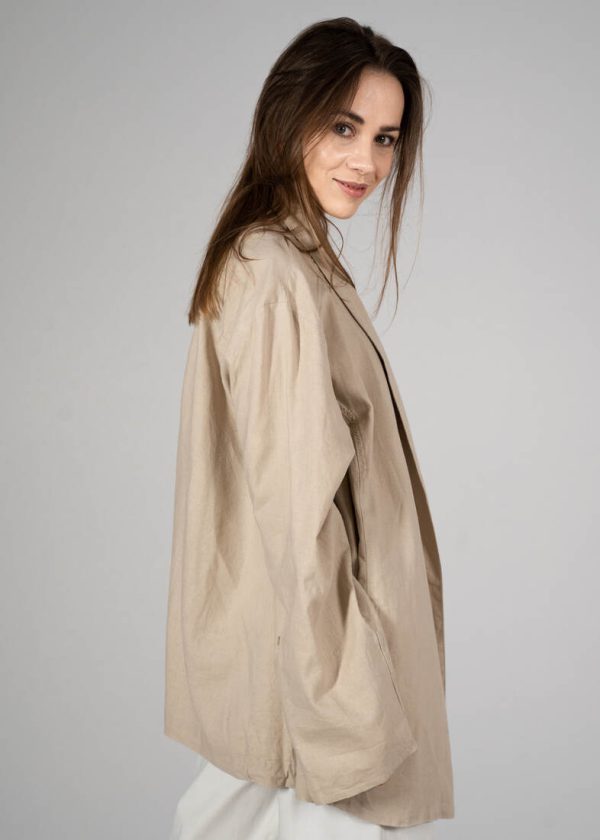 Skład: 55% len, 45% wiskoza. Modelka ma 165 cm wzrostu i nosi rozmiar XS-S.Szerokość w klatce 59 cm