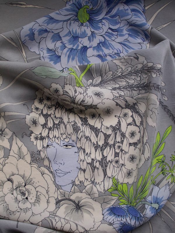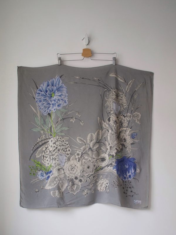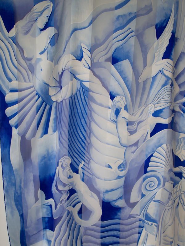 250,00 złUnikatowa chusta vintage francuskiego projektanta Jean Patou, inspirowana stylem art déco. Piękny, monochromatyczny wzór w odcieniach błękitu przedstawia mityczne syreny, żaglowce i morskie fale. Wykonana z delikatnego jedwabiu, ręcznie rolowana. Vintage z lat 70. Bez wad.