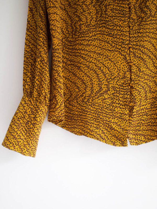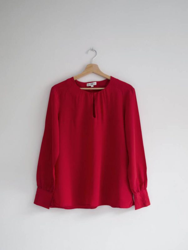 80,00 zł65,00 złBluzka w soczystym kolorze, wykonana z mieszanki jedwabiu i wiskozy. Dekolt zapinany na haftkę, mankiety z pięknymi guzikami. Rozmiar z metki 40, bardzo dobry stan.