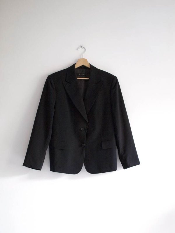 Skład: materiał wierzchni 100% wełna 120, podszewka 51% wiskoza, 49% acetat.Szerokość w ramionach 42, 5 cm