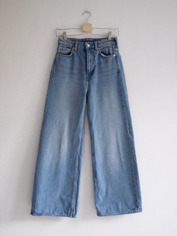 110,00 złJeansy marki Weekday, model Ace high wide jeans. Szerokie nogawki, bardzo wysoki stan, w 100% wykonane z bawełny. Rozmiar z metki 24, polecam na XS-S. Bez wad.