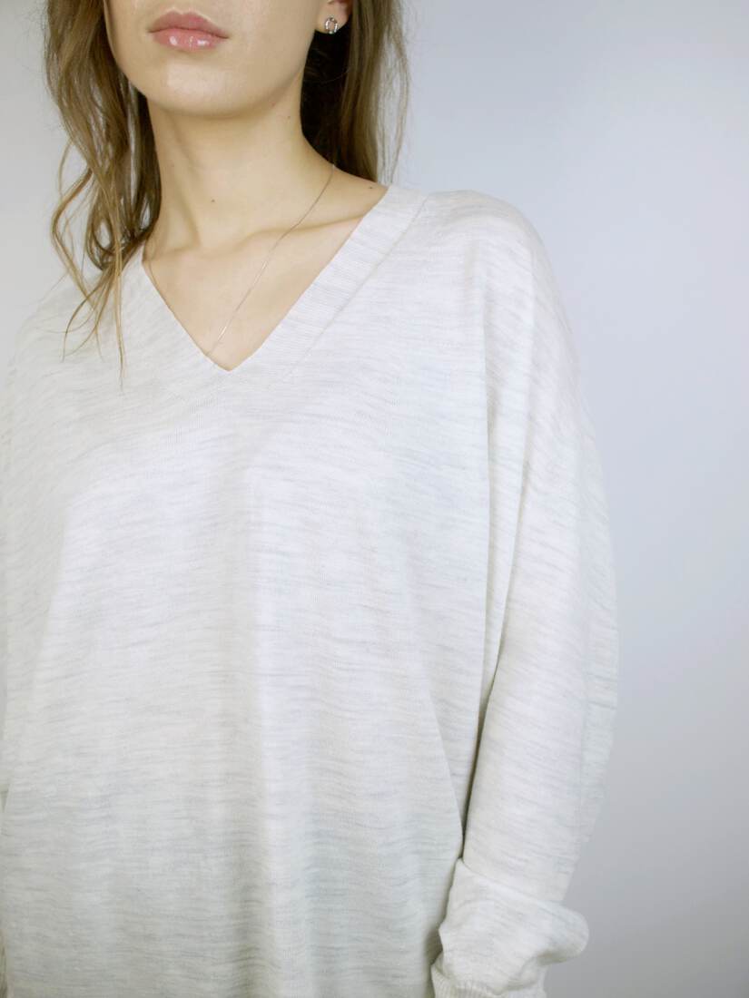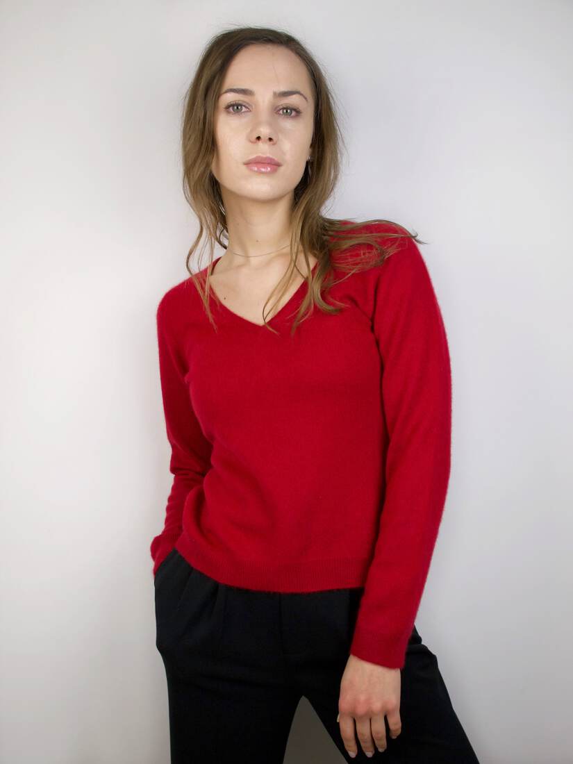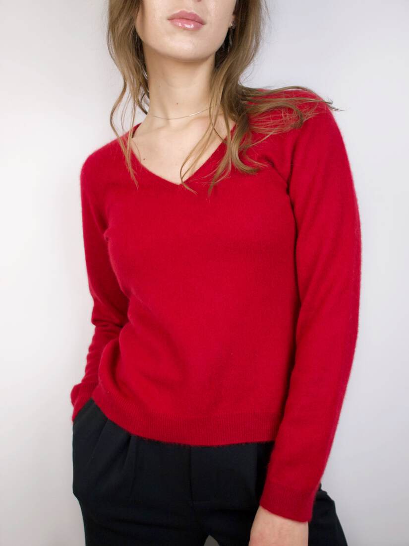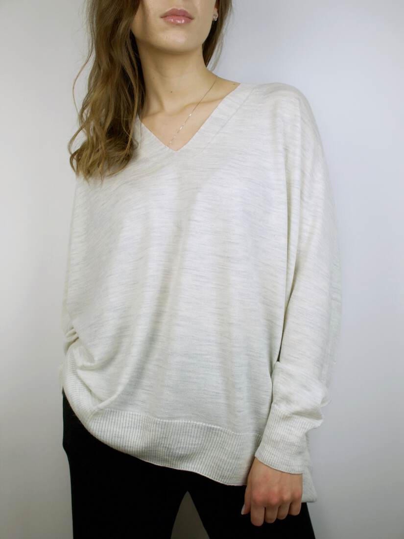 Kaszmirowy sweter z dekoltem w serek. Dopasowany fason. Metka z rozmiarem wycięta, polecam na XS. Bez wad.