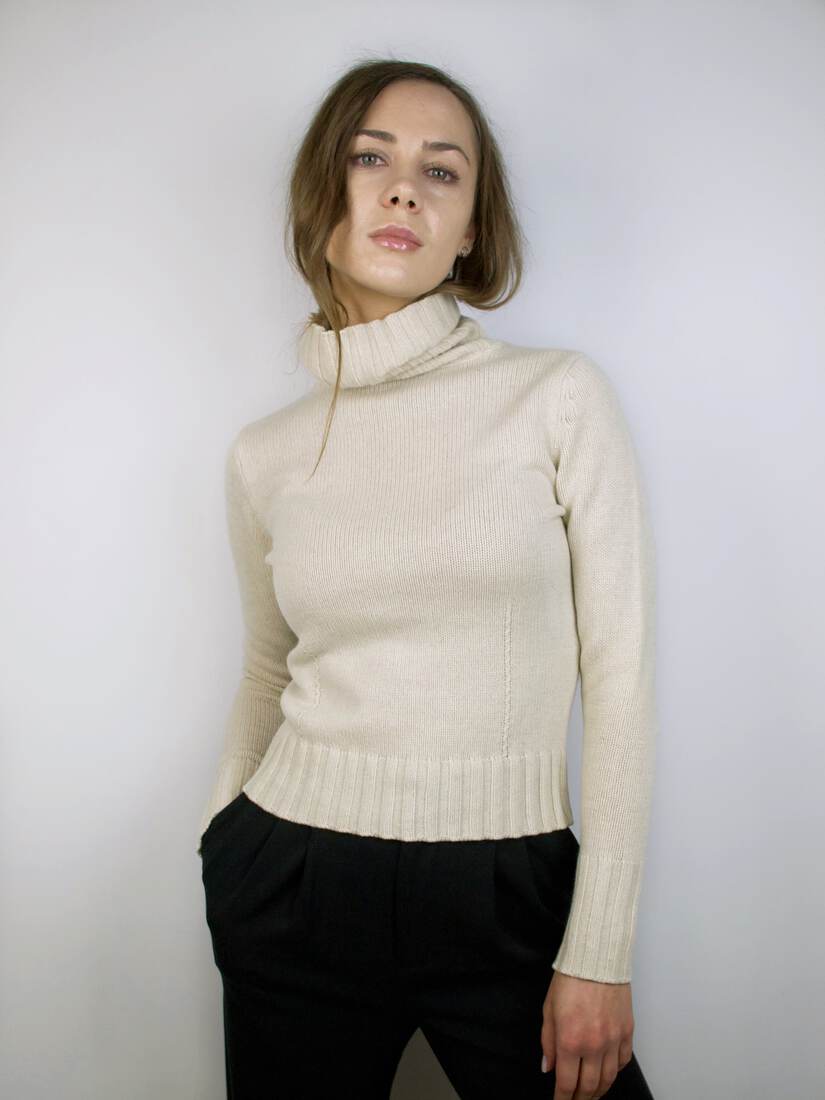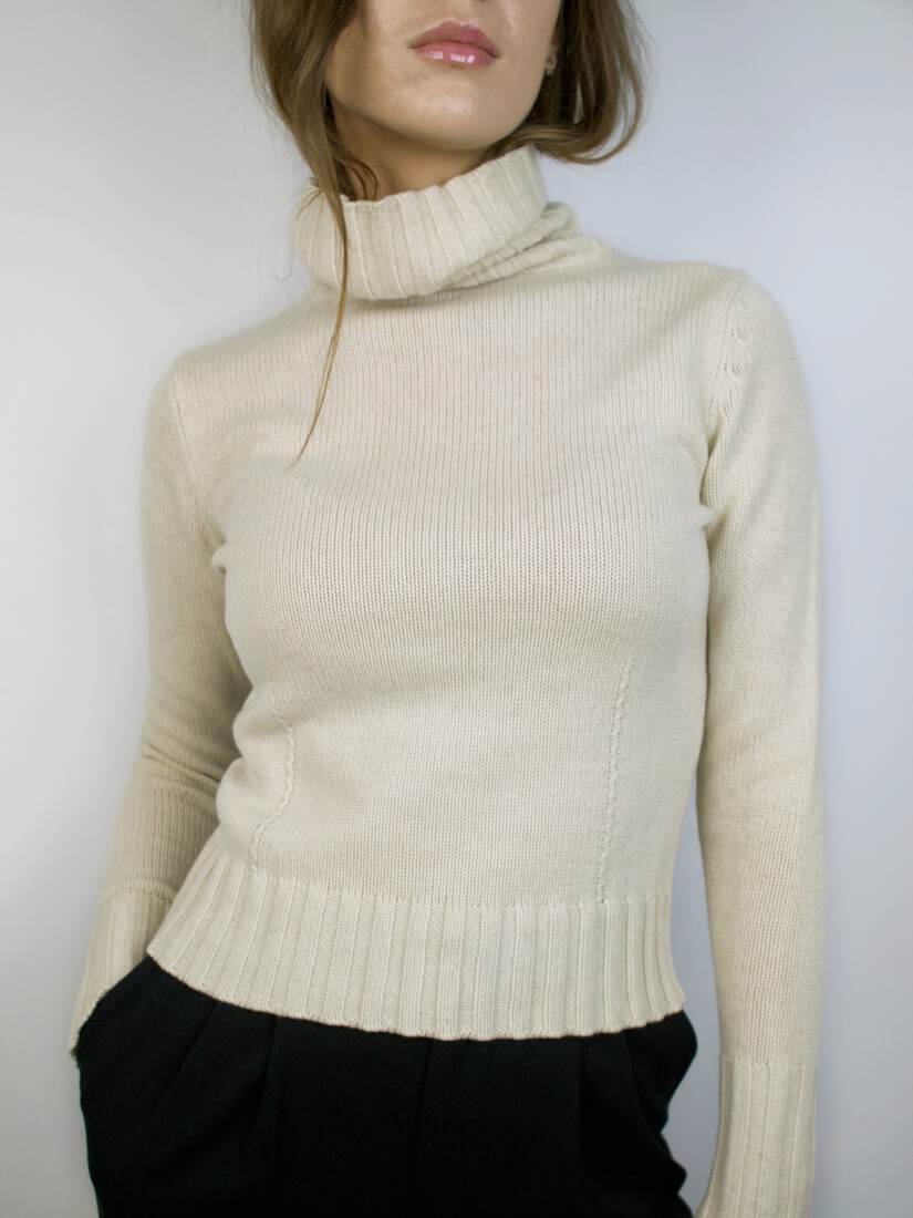 Mięciutki kaszmirowy golf. Brak metki z rozmiarem, polecam na XS. Wycięta metka ze składem, ale jest to kaszmir. Poza brakiem metki bardzo dobry stan.
