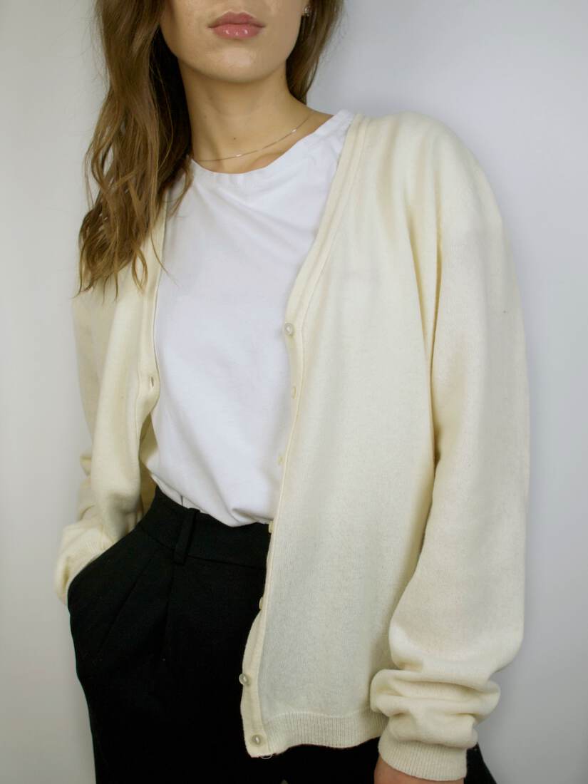 Wełniany kardigan marki Benetton. Wycięta metka z rozmiarem, jest dość uniwersalny, moim zdaniem będzie pasować na M, lub na mniejsze jako luźny. Idealny stan.