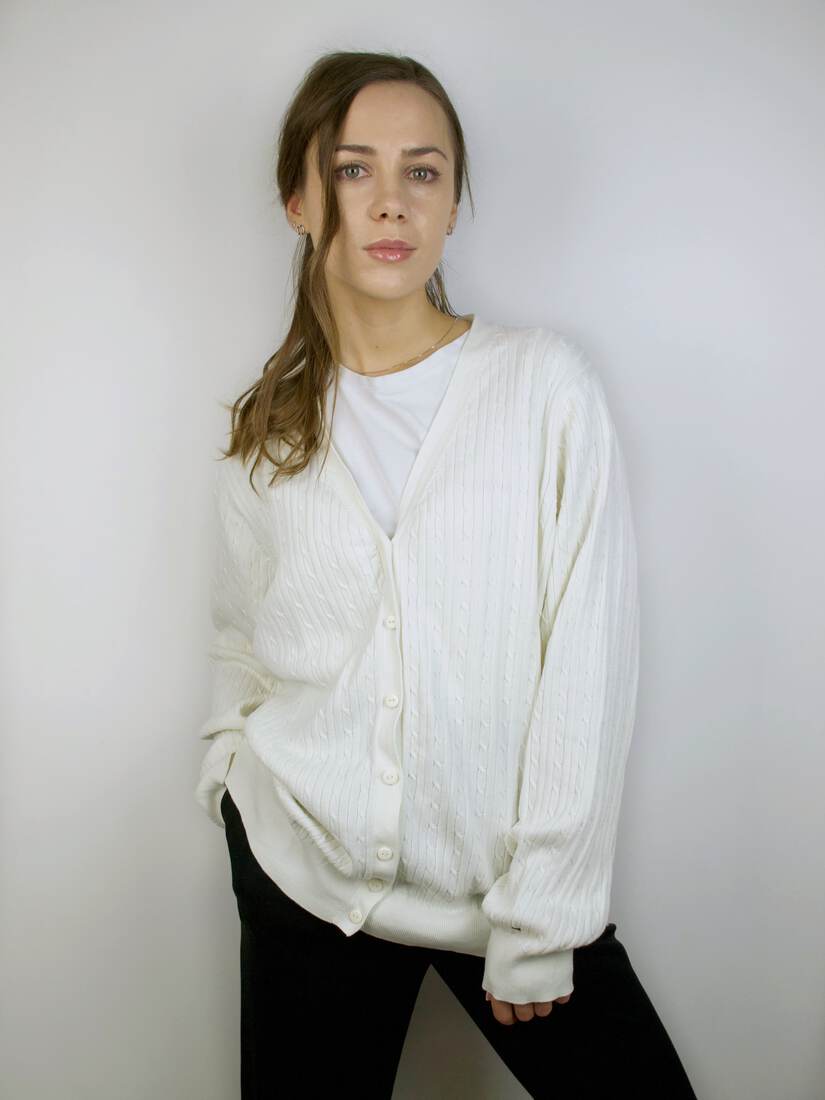 Kardigan renomowanej marki Tommy Hilfiger. Wykonany z bawełny Pima, uważanej za najlepszą na świecie. Rozmiar z metki L, idealny jako oversize. Bez wad.