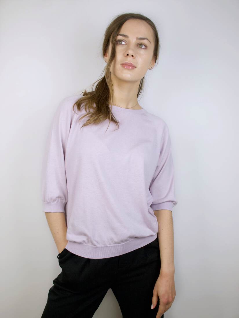 Liliowa bluzka szwedzkiej marki Filippa K. Wykonana z materiału z dużym udziałem jedwabiu. Rozmiar z metki M, dość uniwersalny. Z tyłu na plecach mała kropka, pokazana na zdjęciu, poza tym bez wad.