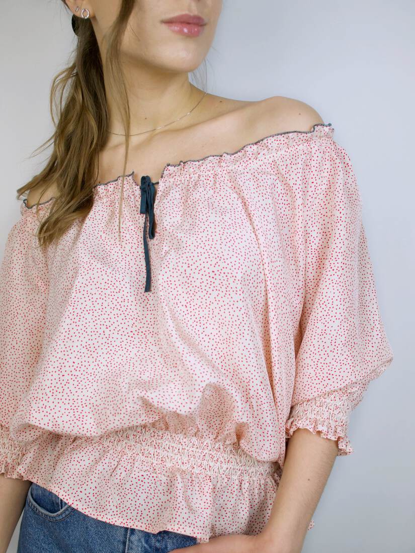 Modelka nosi rozmiar XS-S. Skład: 52% jedwab, 13% bawełna, 35 % poliester.Szerokość w klatce 50 cm