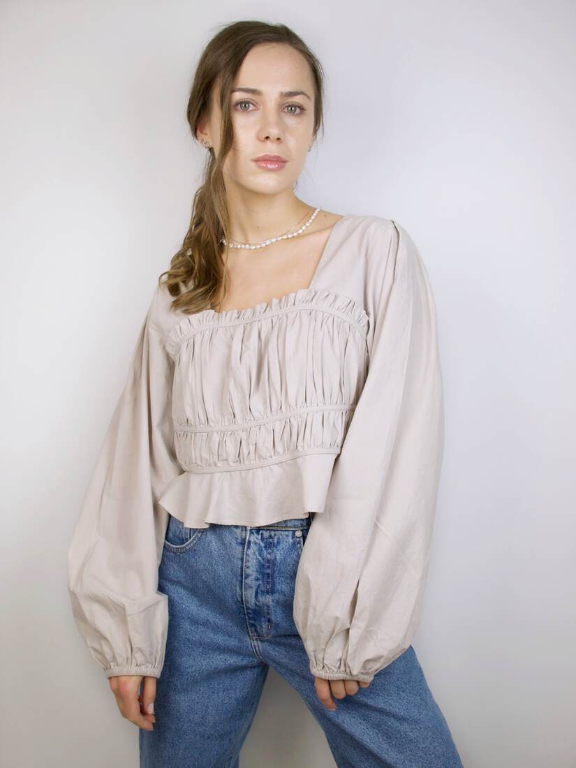 Modelka ma 165 cm wzrostu i nosi rozmiar XS-S.Szerokość w pasie 35 cm