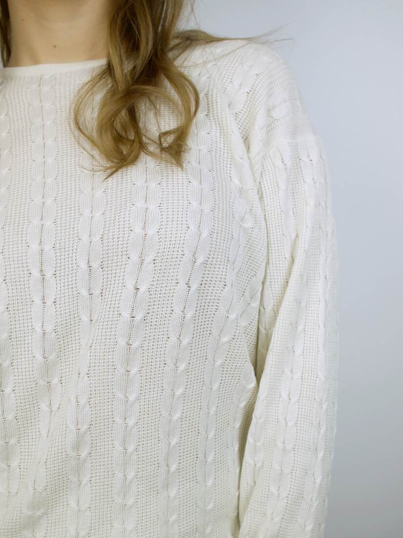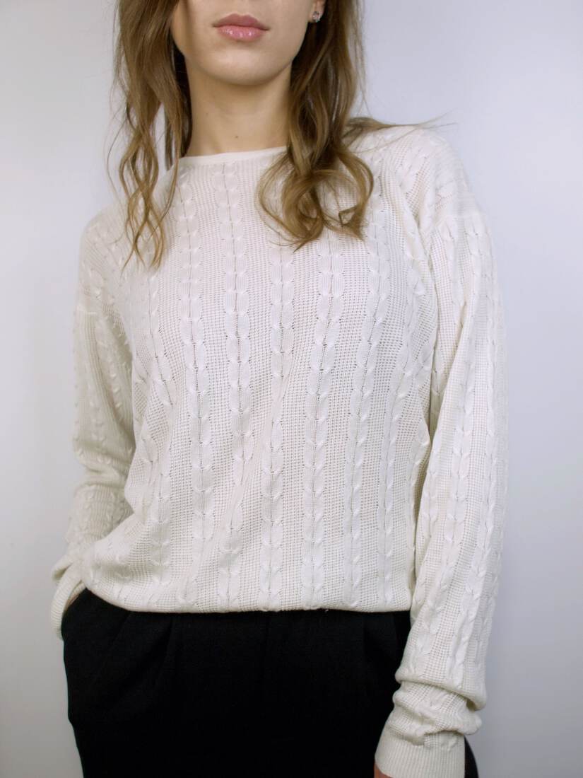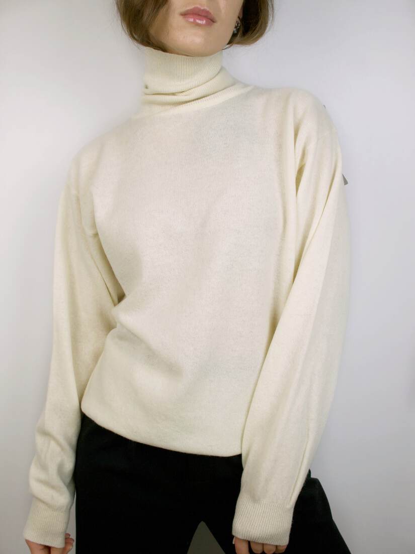 Śmietankowy golf vintage wykonany z wełny jagnięcej, z małym dodatkiem nylonu. Ma 2 malutkie zacerowania, pokazane na zdjęciu, nie są widoczne w noszeniu. Poza tym bez wad. Rozmiar z metki L.