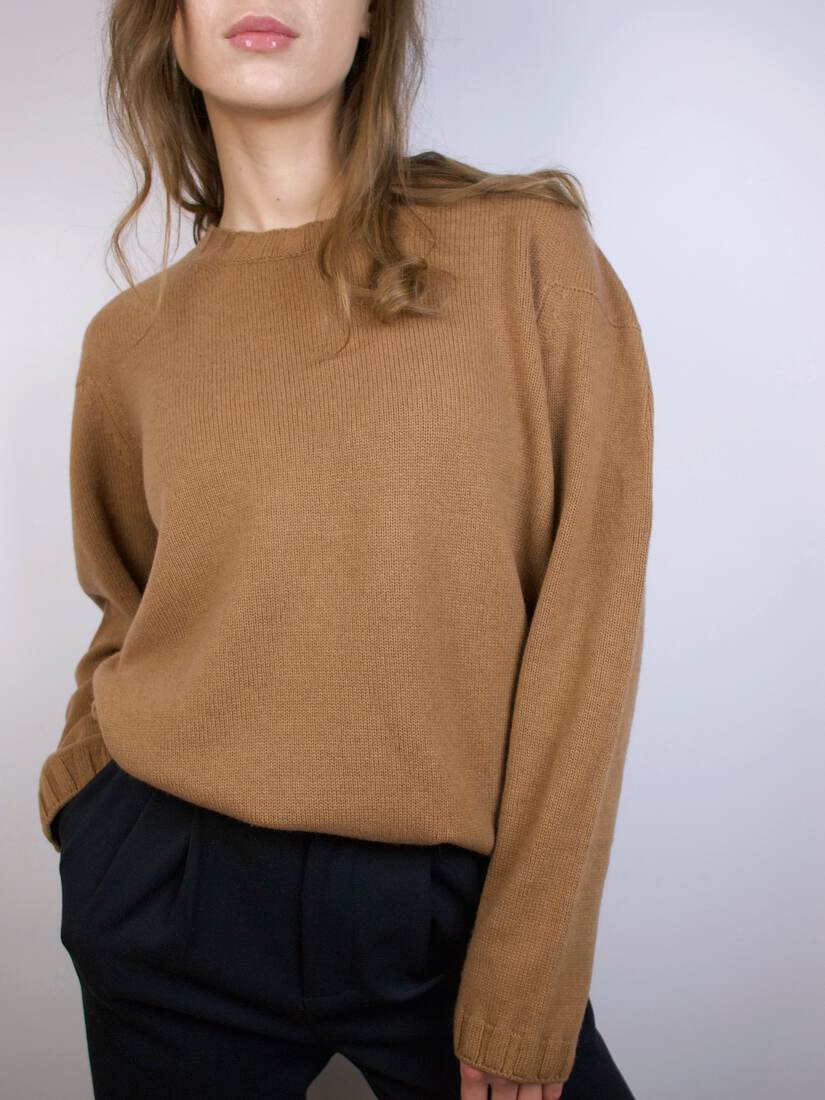 Sweter w karmelowym kolorze marki Maria Di Ripabianca, wyprodukowany we Włoszech. Wykonany z wysokogatunkowej mieszanki wełny i kaszmiru z dodatkiem jedwabiu, Bardzo miękki i miły w dotyku. Rozmiar z metki 44, polecam na L-XL, lub jako oversize. Idealny stan.