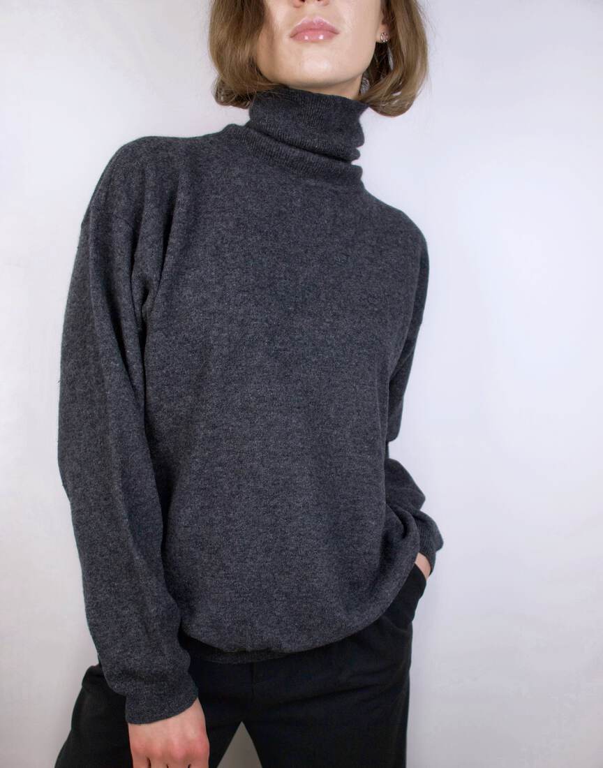 Grafitowy golf vintage, wykonany z miłej w dotyku tkaniny wełnianej z dodatkiem angory. Rozmiar z metki 40, polecam na L-XL, lub jako oversize. Bez wad.