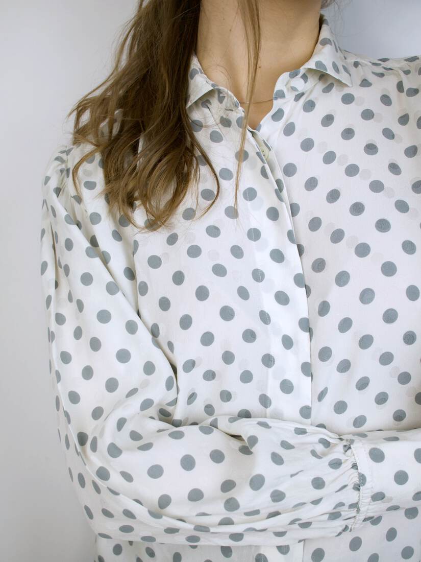 Modelka ma 165 cm wzrostu i nosi rozmiar XS-S. Skład: materiał wierzchni 100% jedwab, podszewka 100% wiskoza.