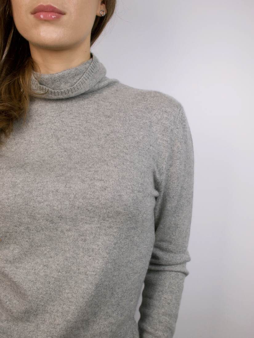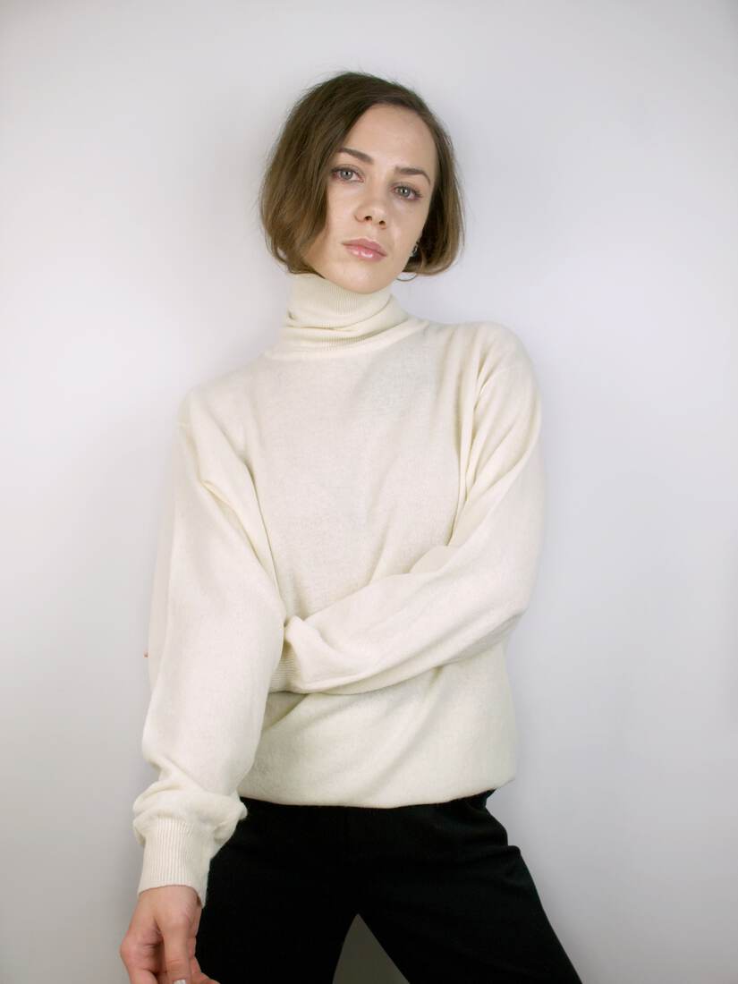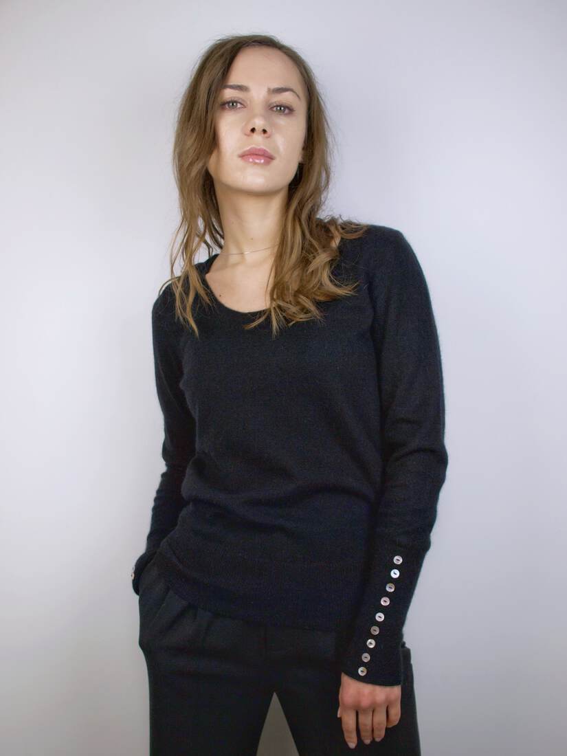 Modelka nosi rozmiar XS-S. Skład: 55% wełna, 30% kaszmir, 15% jedwab.Szerokość w klatce 56 cm
